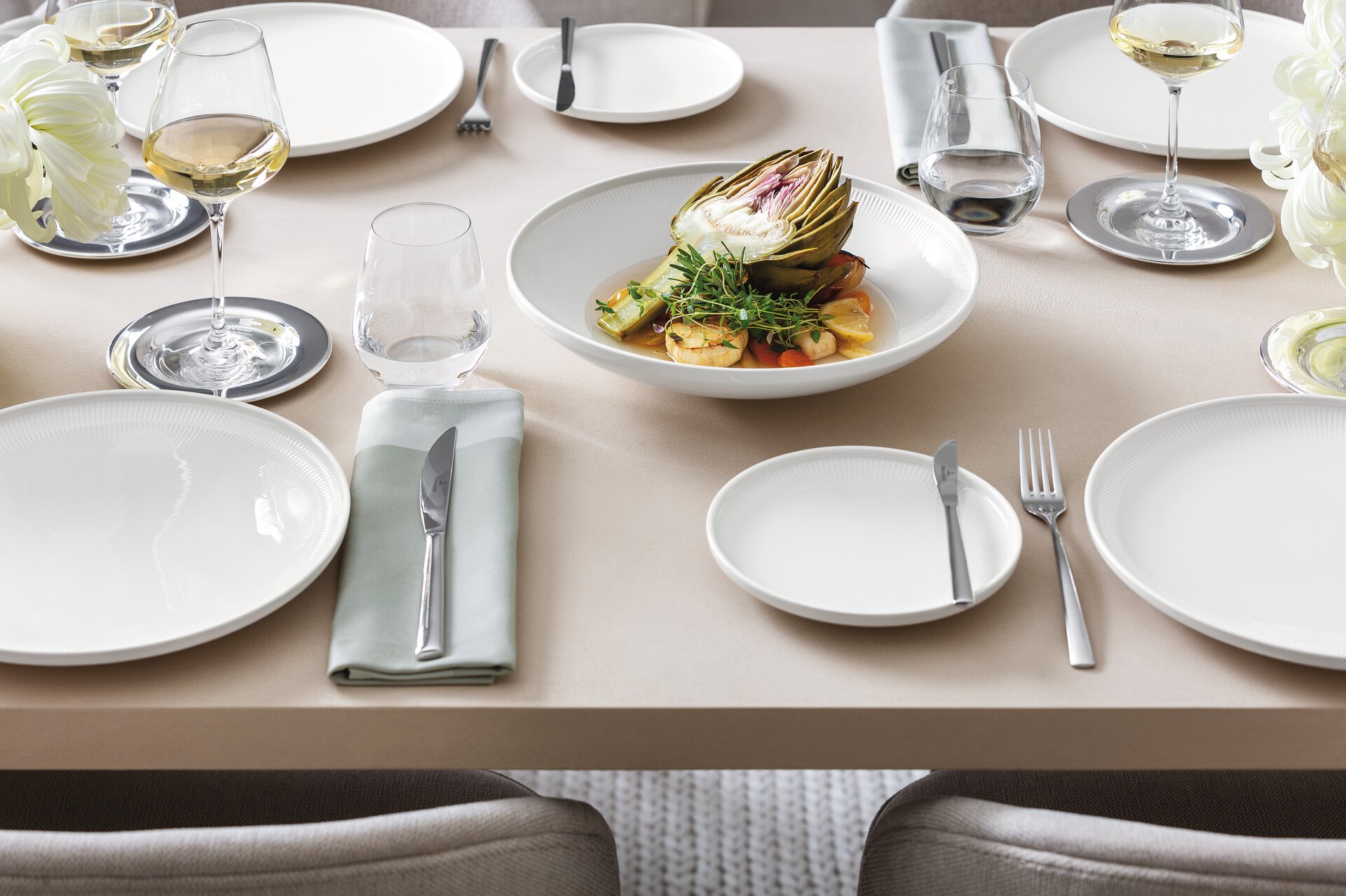 Ein wahres Meisterwerk aus Design- und Porzellanexpertise: Die Afina-Kollektion wurde in Zusammenarbeit mit dem renommierten deutschen Designer Christian Haas entwickelt. Ihre charakteristischen Merkmale umfassen ein filigranes Relief, inspiriert von konzentrischen Sonnenstrahlen, eine zeitgemäße Coupe-Form mit erhöhten Rändern und eine einzigartige schwebende Anmutung. Afina ist hergestellt in Deutschland aus hochwertigem Premium Porcelain und repräsentiert die außergewöhnliche Handwerkskunst von Villeroy&Boch.