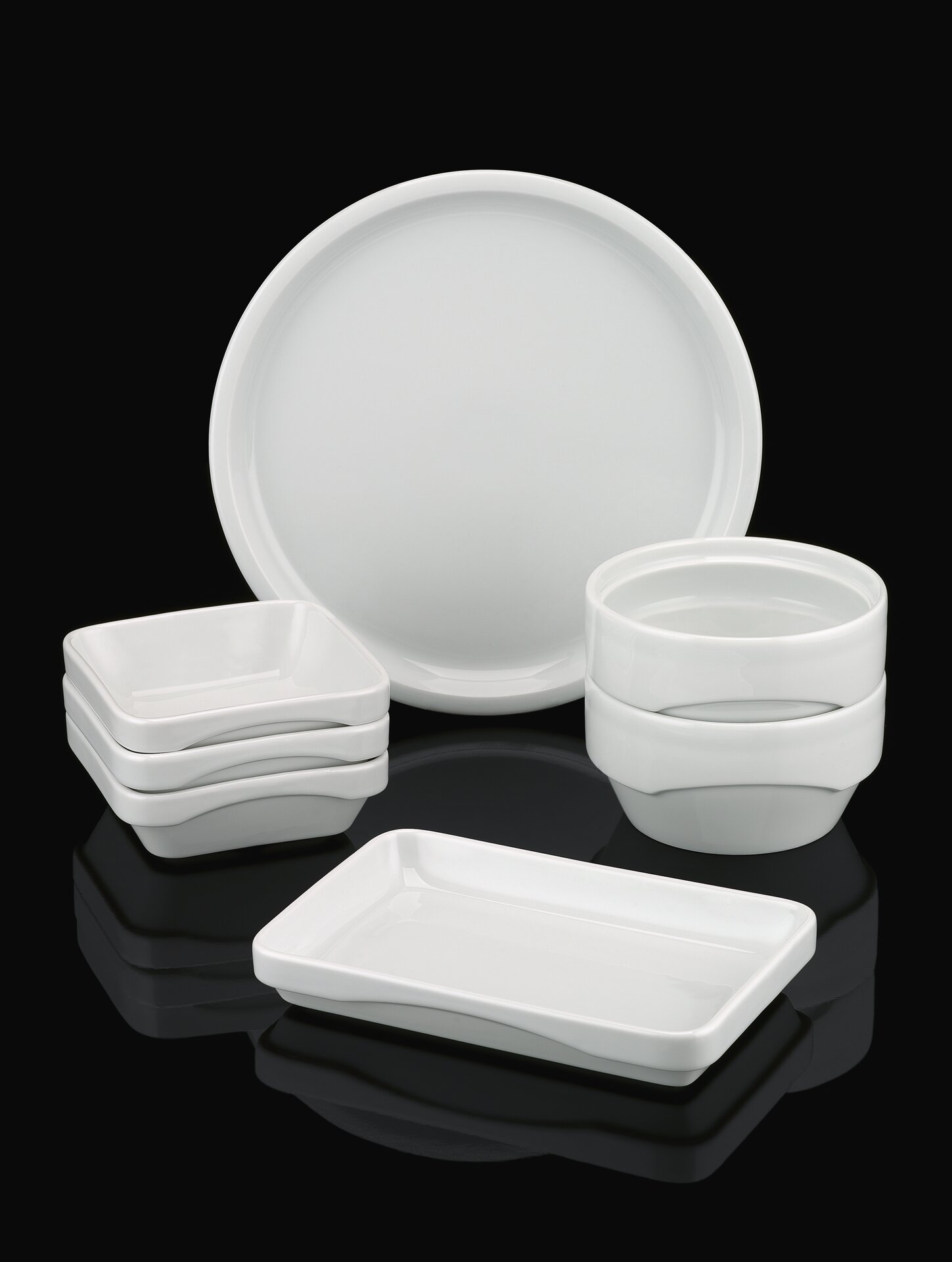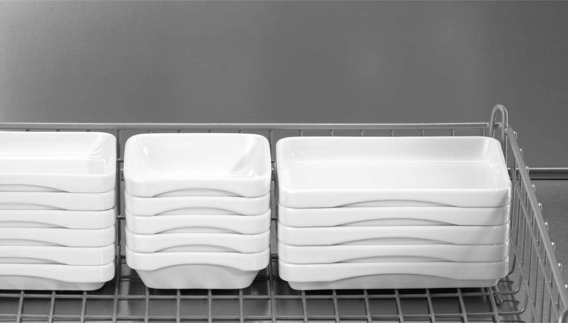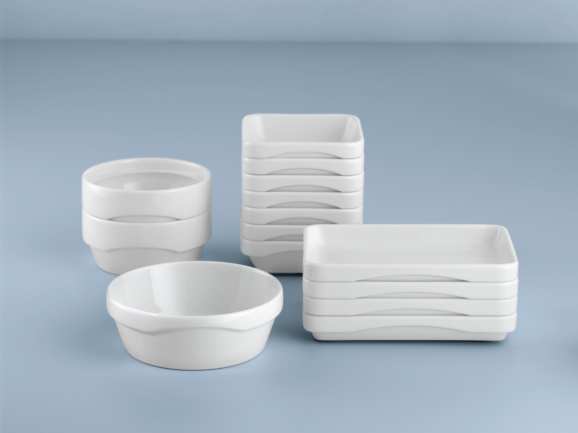 Die bogenförmigen Aussparungen im Stapelrand der Airflow Artikel erfüllen zwei Funktionen: Im gestapelten Zustand schaffen sie schmale Lüftungsöffnungen. Diese ermöglichen einen einfacheren Luftaustausch und unterstützen ein schnelles Nachtrocknen der Artikel nach dem Spülen. Gleichzeitig erlaubt die ergonomische Gestaltung ein leichteres Handling beim Portionieren und Reinigen.