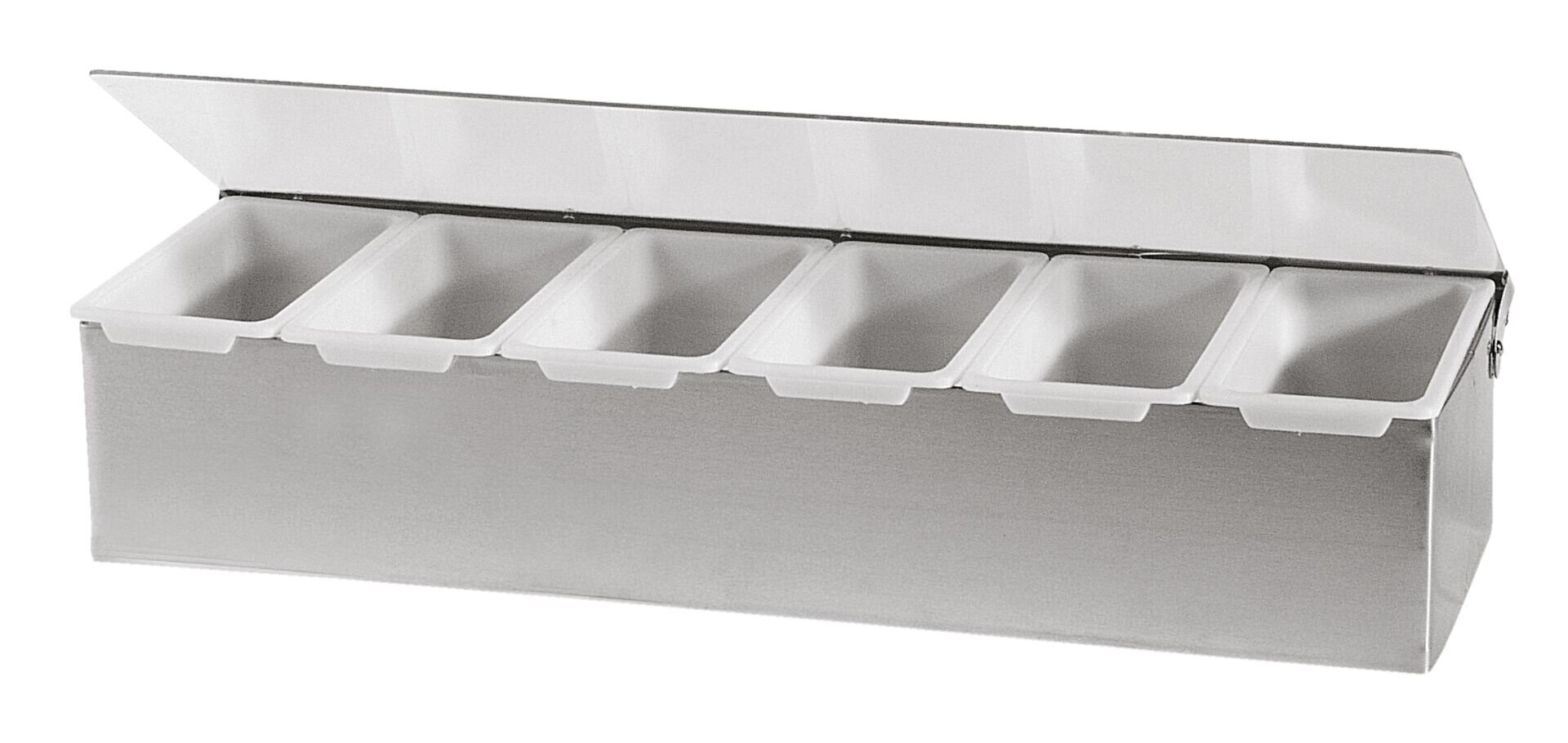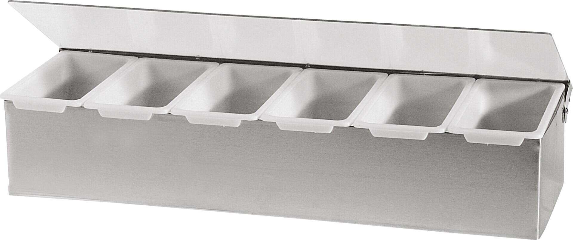 Edelstahl, mit Fächern aus Kunststoff à 0,5L. Deckel transparent. Ein unentbehrlicher Behälter für alle Zutaten in der Bar, wie Kirschen, Oliven, Limonenscheiben usw.