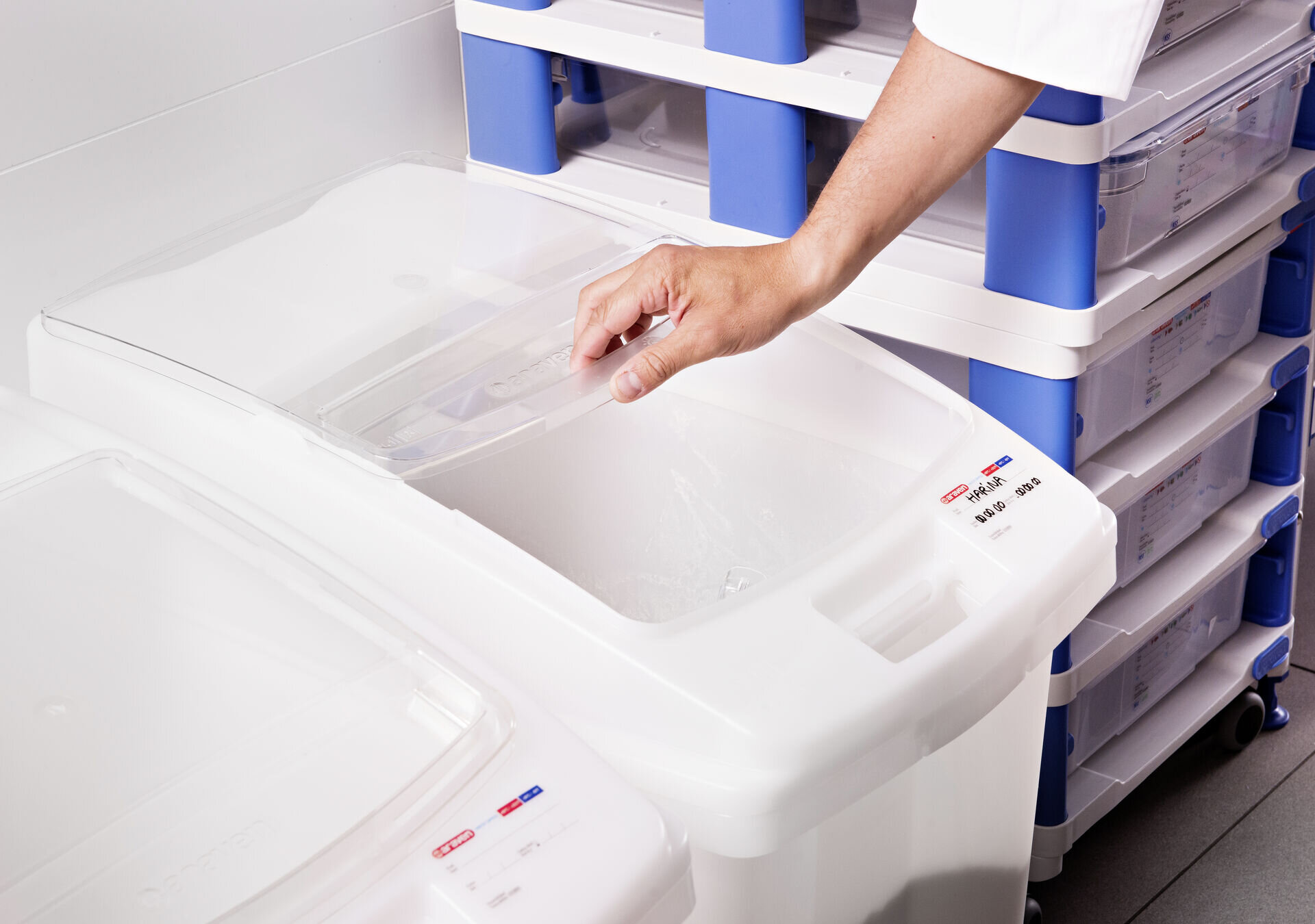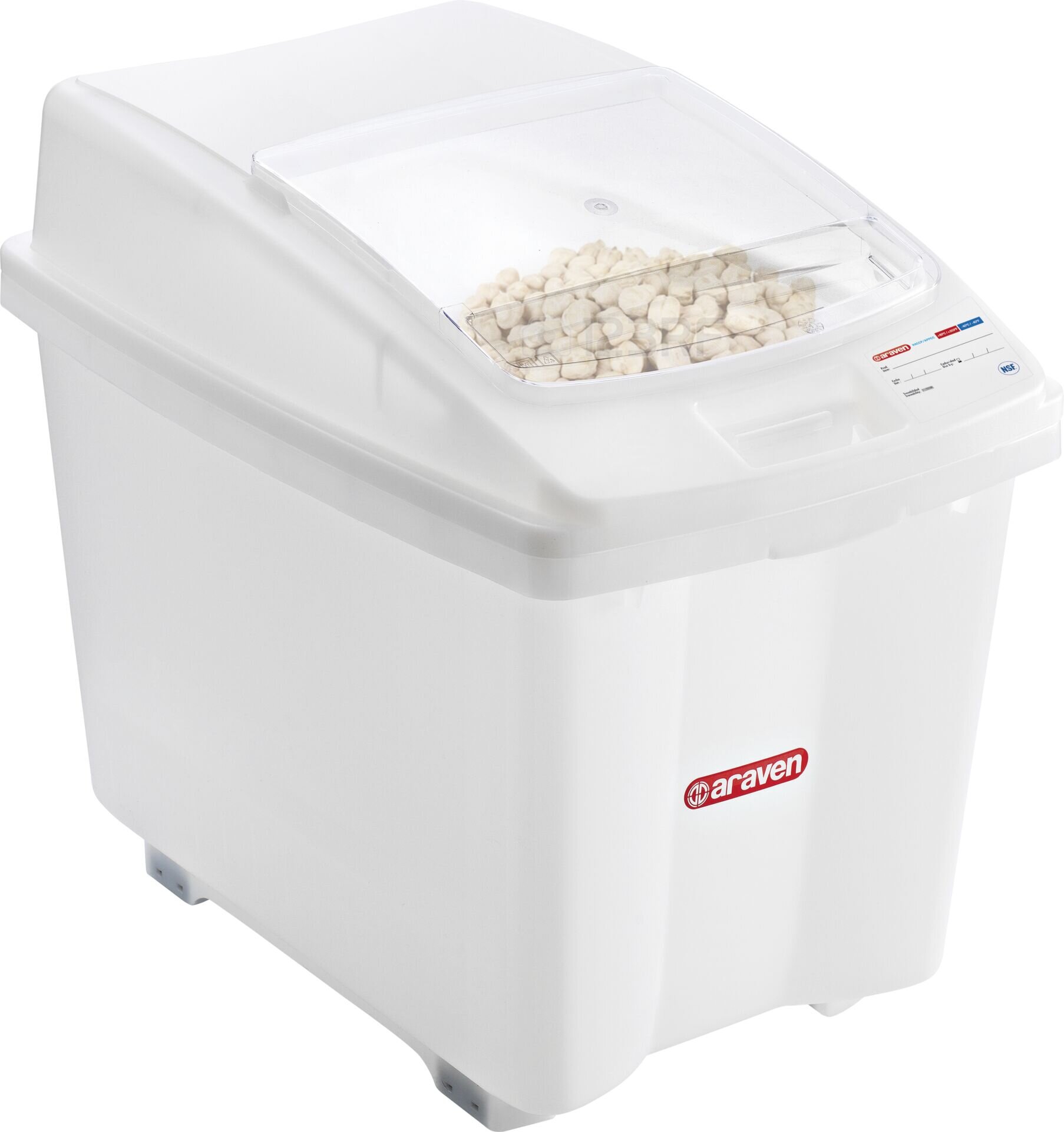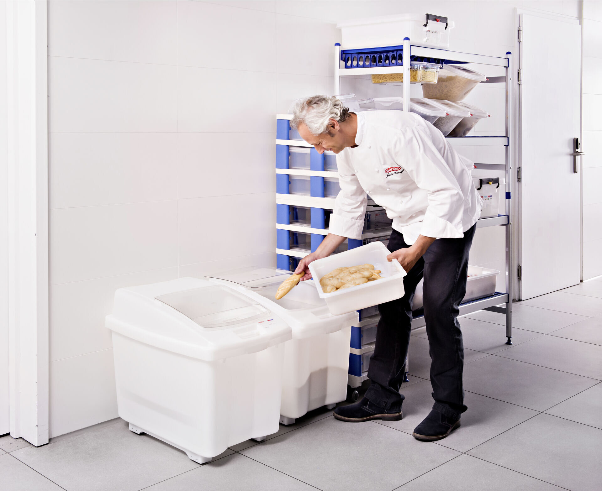 HDPE-Hart-Polyethylen, transparent. Aufgedrucktes Etikett zum Beschriften mit Stift Art.-Nr. 146700. Einfache Befüllung und Entnahme mit Schaufel Art.-Nr. 11601 + 11602. Deckel als Sichtfenster und mit Schnappverschluss. Mit seitlichen Griffen für einfache Handhabung & Transport. Abgerundete Kanten. Spülmaschinengeeignet.