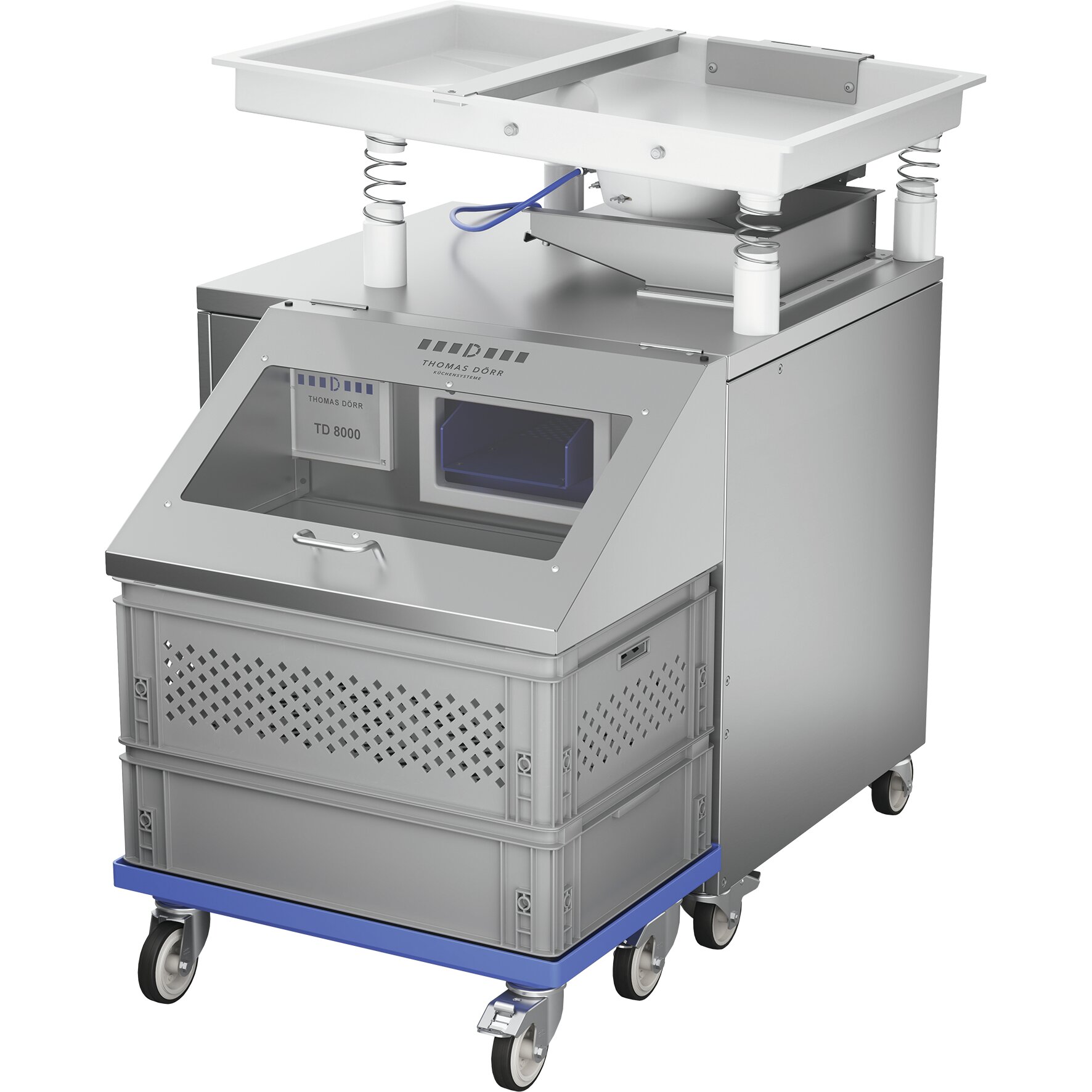 Die FILL&GO-Variante unseres Power-Modells TD 8000 trocknet und poliert nicht nur 8.000 Besteckteile pro Stunde, sondern befüllt sich auch automatisch selbst. Das gewaschene und nasse Besteck wird dazu einfach direkt aus den Spülmaschinenkörben auf die integrierte Rutsche gegeben.