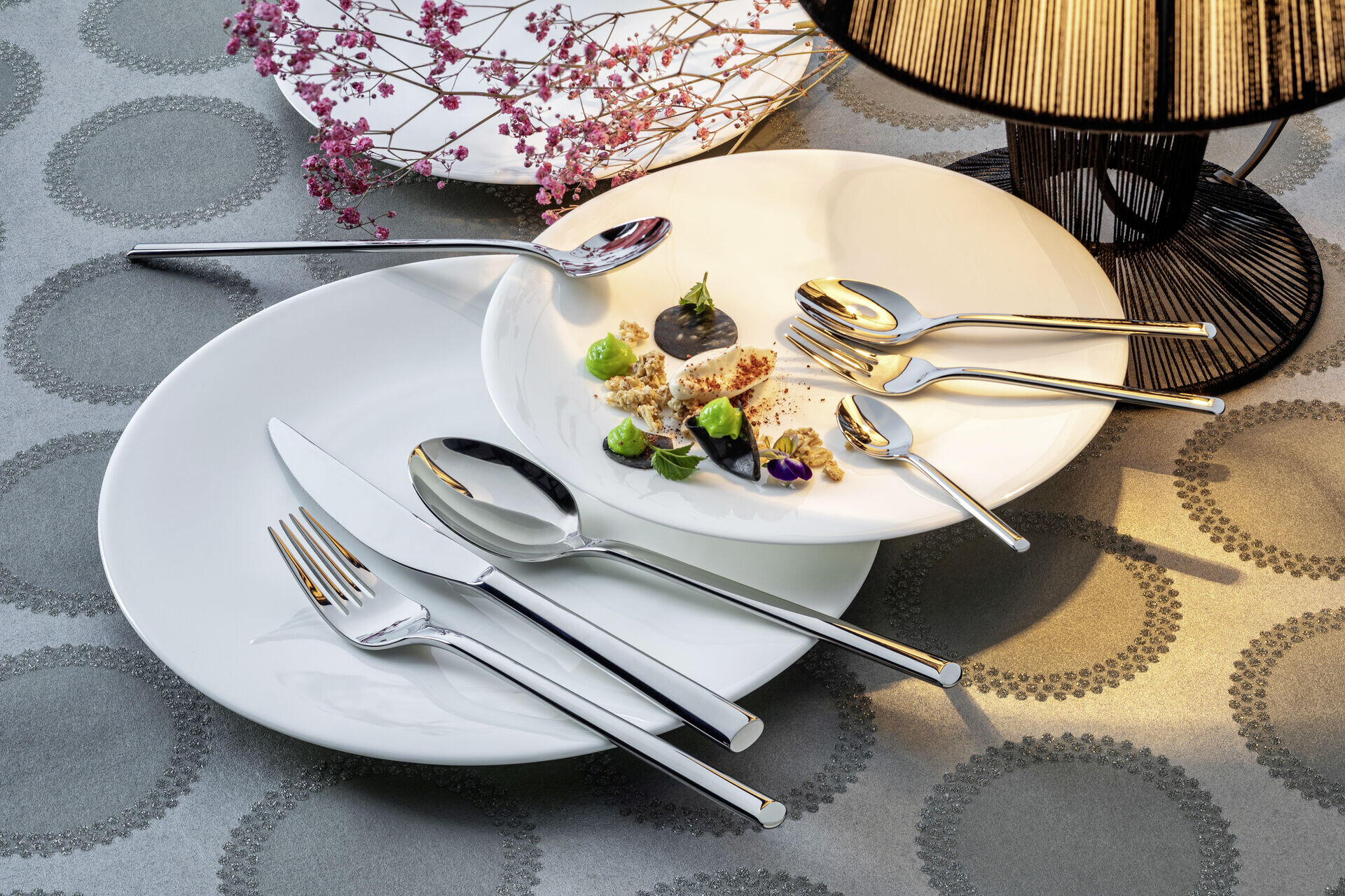 Chrom-Nickel-Stahl 18/10, rostfrei, poliert. Messer mit geschmiedeter Klinge. 4,0 mm stark. Ausführung: Tafelgabel Länge in…