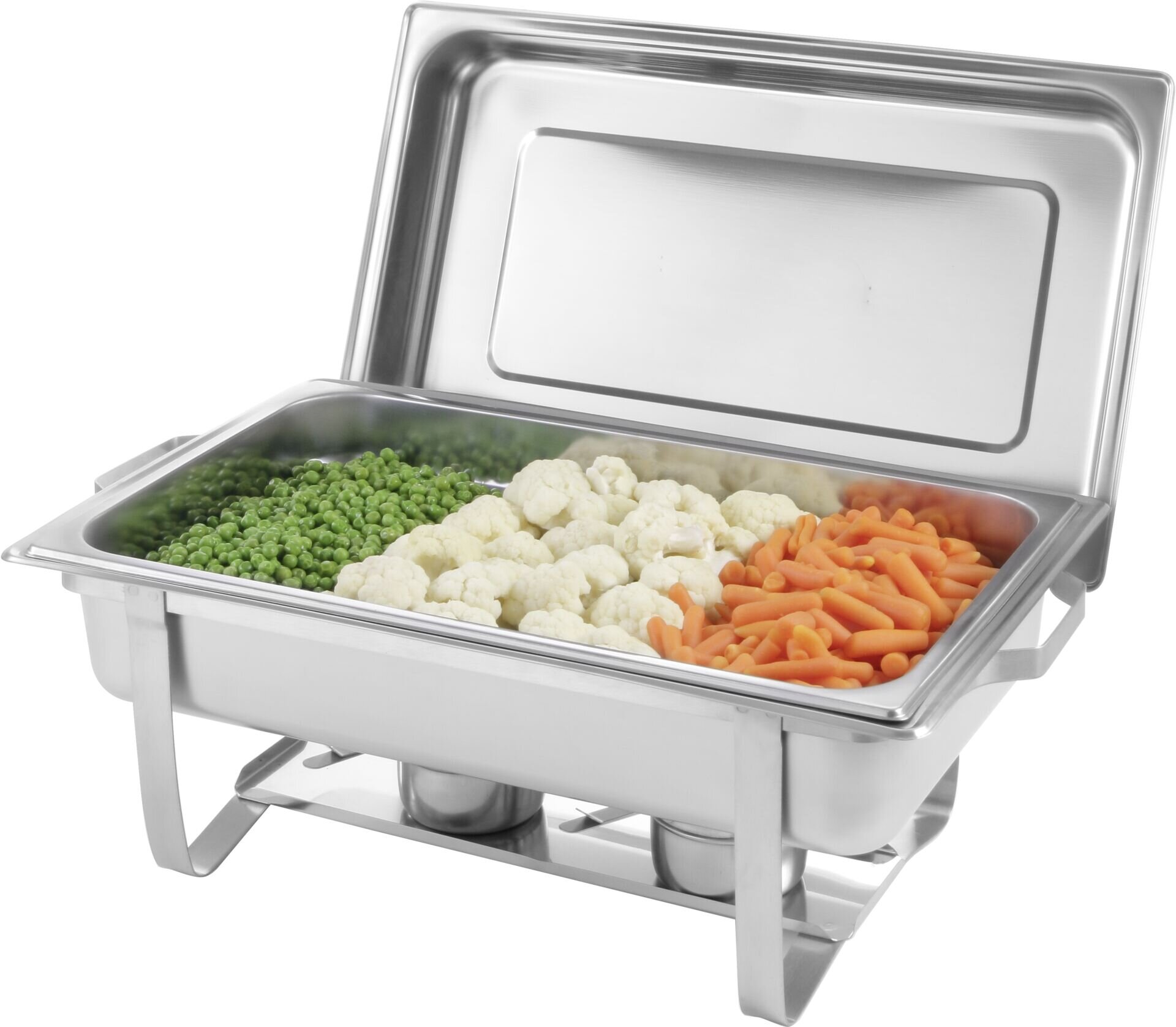 Edelstahl: 18/0, Inhalt: 9 Liter. Mit jeweils einem hochglanzpolierten, einsteckbaren Deckel, einer GN 1/1 Lebensmittelpfanne, 65 mm tief und 2 Brennpastenbehältern. Geeignet für Gastronorm Behälter bis 65 mm tief.