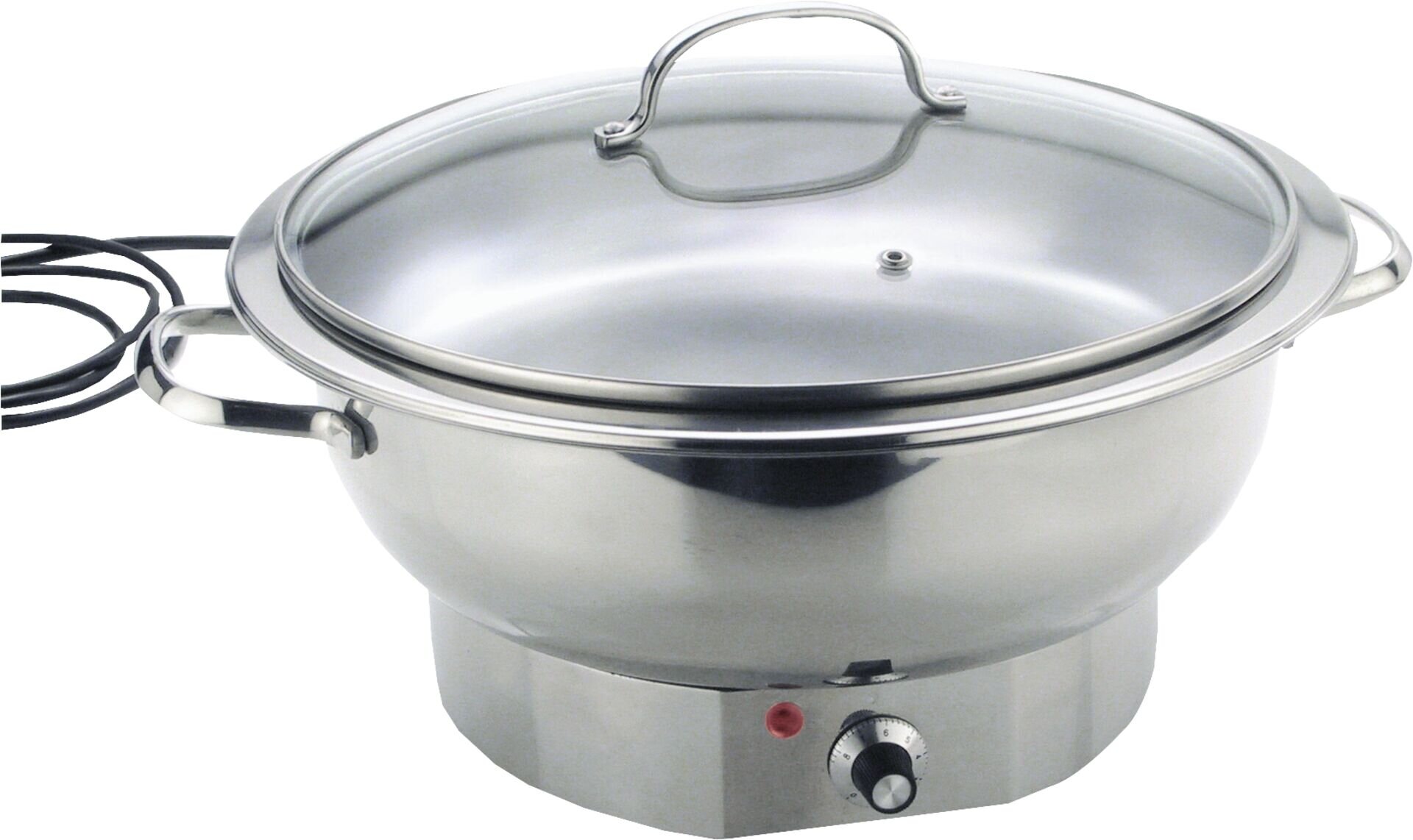 Edelstahl 18/10, rund, mit Glasdeckel, elektrisches Thermostat mit Überhitzungsschutz. Mit Speiseeinsatz (3,8 Liter).