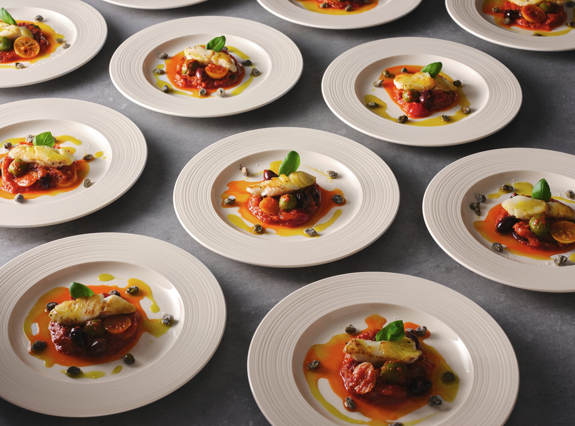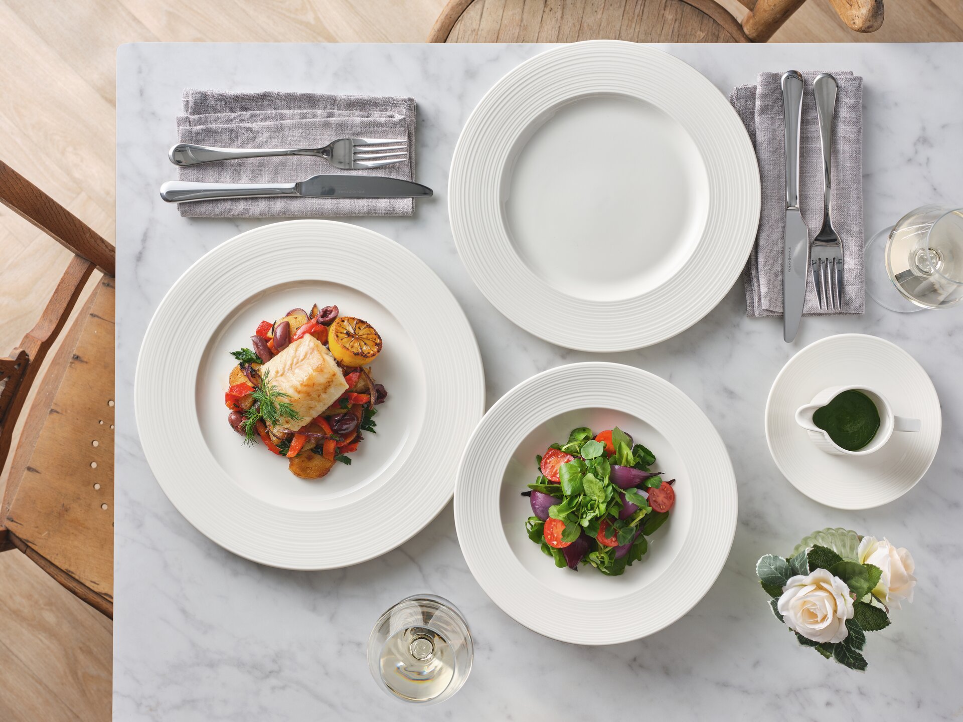 Die Concorde-Reihe ist von der anspruchsvollen Ästhetik des klassischen Mid-Century-Stils durchdrungen. Klare Linien und eine frische, dezente haptische Oberfläche harmonieren mit einem warmen, ansprechenden, cremefarbenen Ton, um einen lässigen und dennoch klaren Präsentationsstil für Speisen zu schaffen. Alle Artikel wurden sorgfältig entworfen, um in einer geschäftigen Küche diskret zu funktionieren und gleichzeitig eine hervorragende Haltbarkeit zu bieten. Ein Schlüsselmerkmal ist die Stapelbarkeit, die eine effiziente Lagerung von Gegenständen ermöglicht, ebenso wie die Kompatibilität, die es ermöglicht, verschiedene Gegenstände übereinander zu stapeln und eine gemeinsame Untertasse zu verwenden. Durch die Verwendung von Coupé- und Randprofilen bietet die Concorde-Reihe eine moderne und dennoch funktionale Ästhetik, um die allerbeste Küche zu präsentieren.