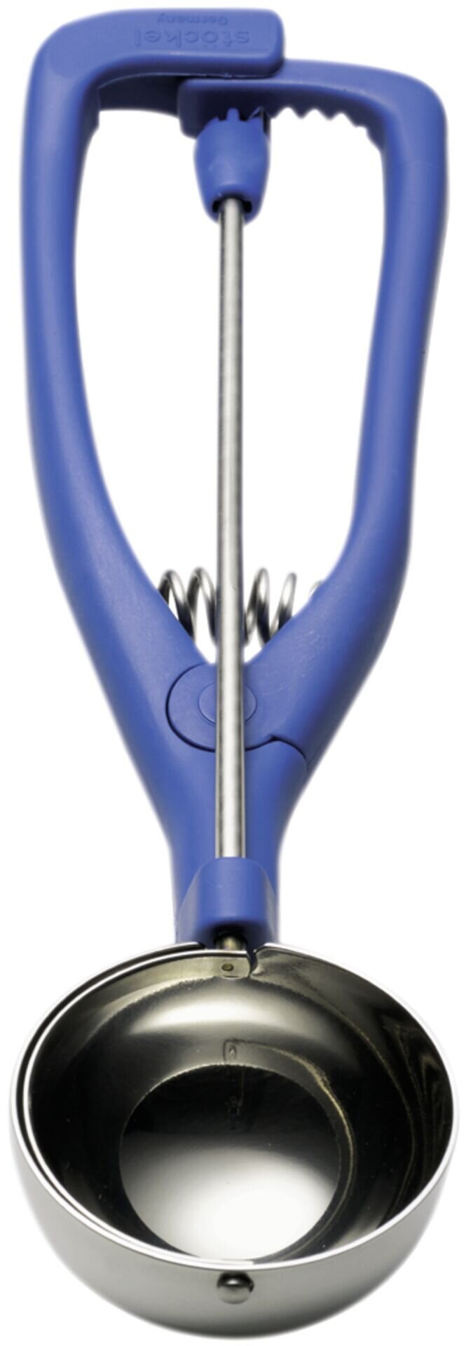 Eisportionierer aus Edelstahl 18/10 mit blauem Kunststoffgriff. Spülmaschinengeeignet. Inhalt in L: 1/100 Ø in cm: 3,0