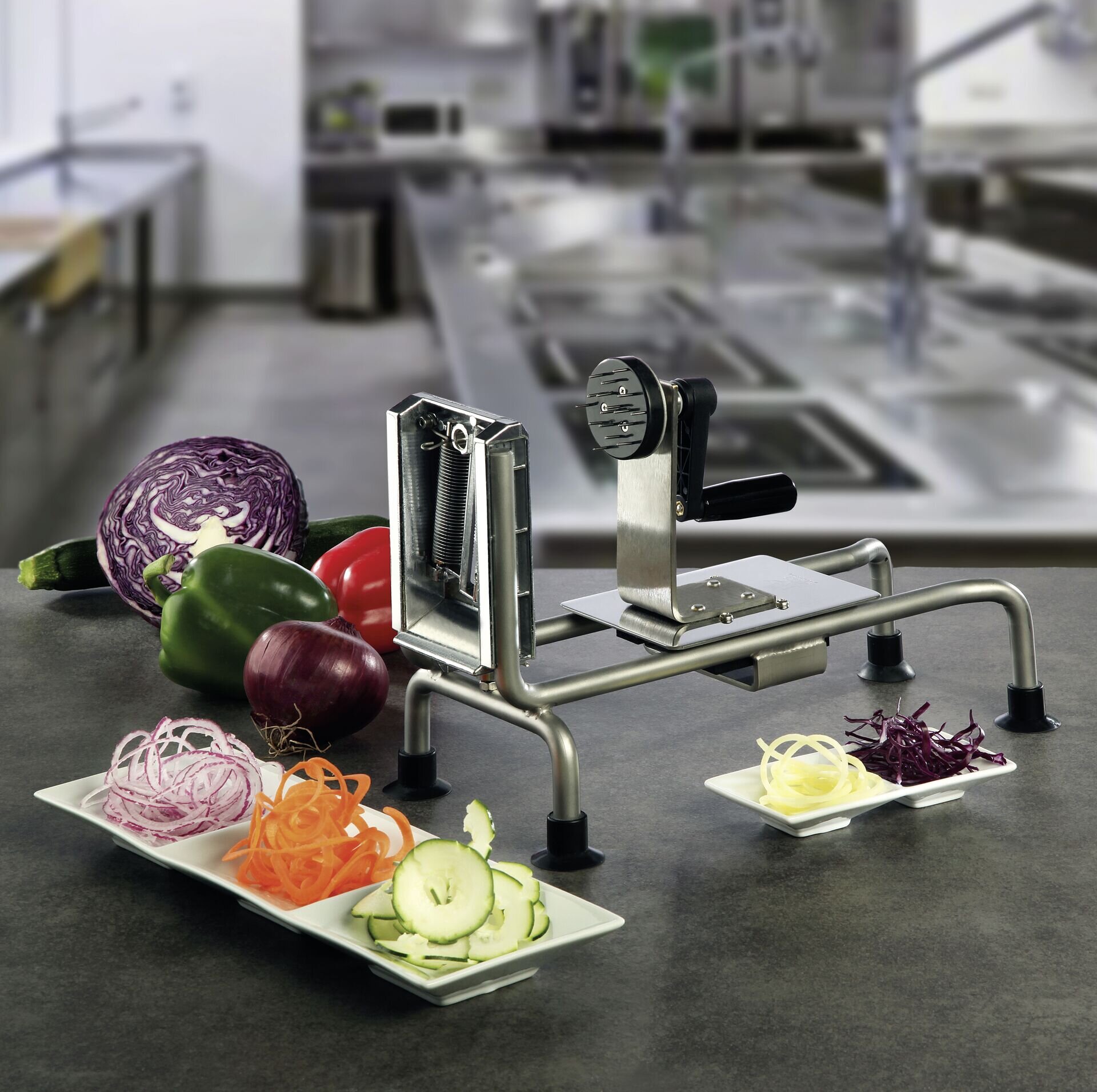 Für dekorative Endlosfäden aus versch. Gemüsesorten. z.B. Möhren, Gurken, Zucchini oder Rotkohl. Edelstahl 18/10 rostfrei, mit Schlitten und Kunststoffkurbel.