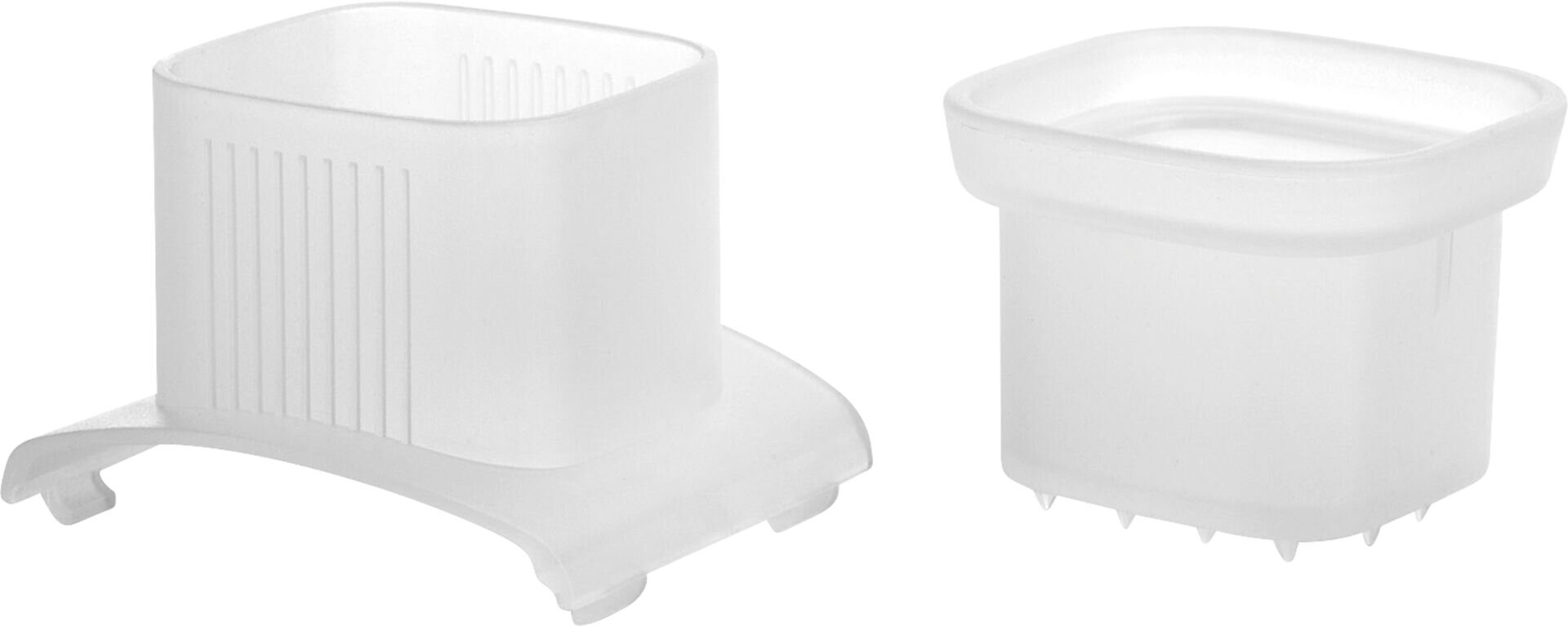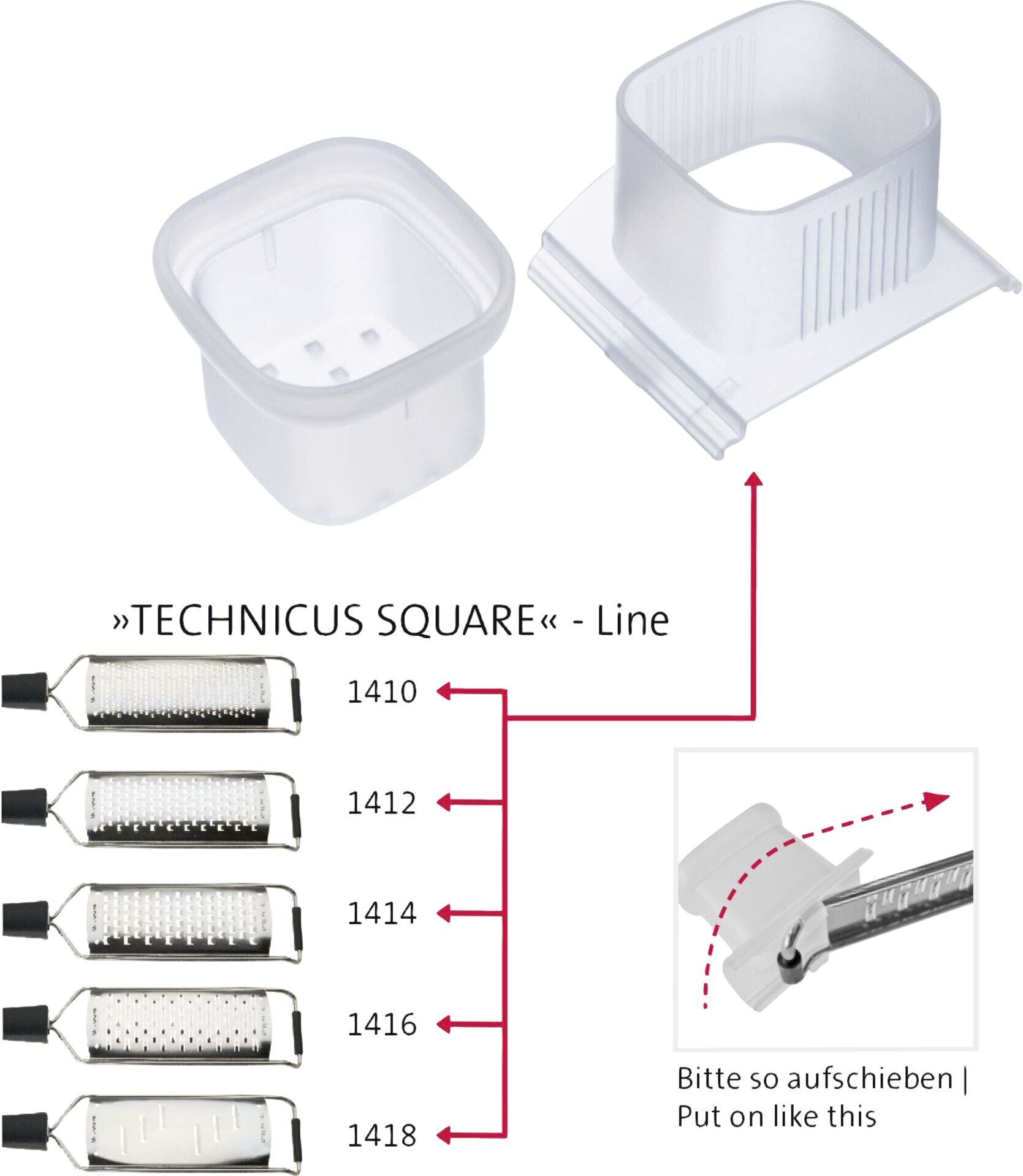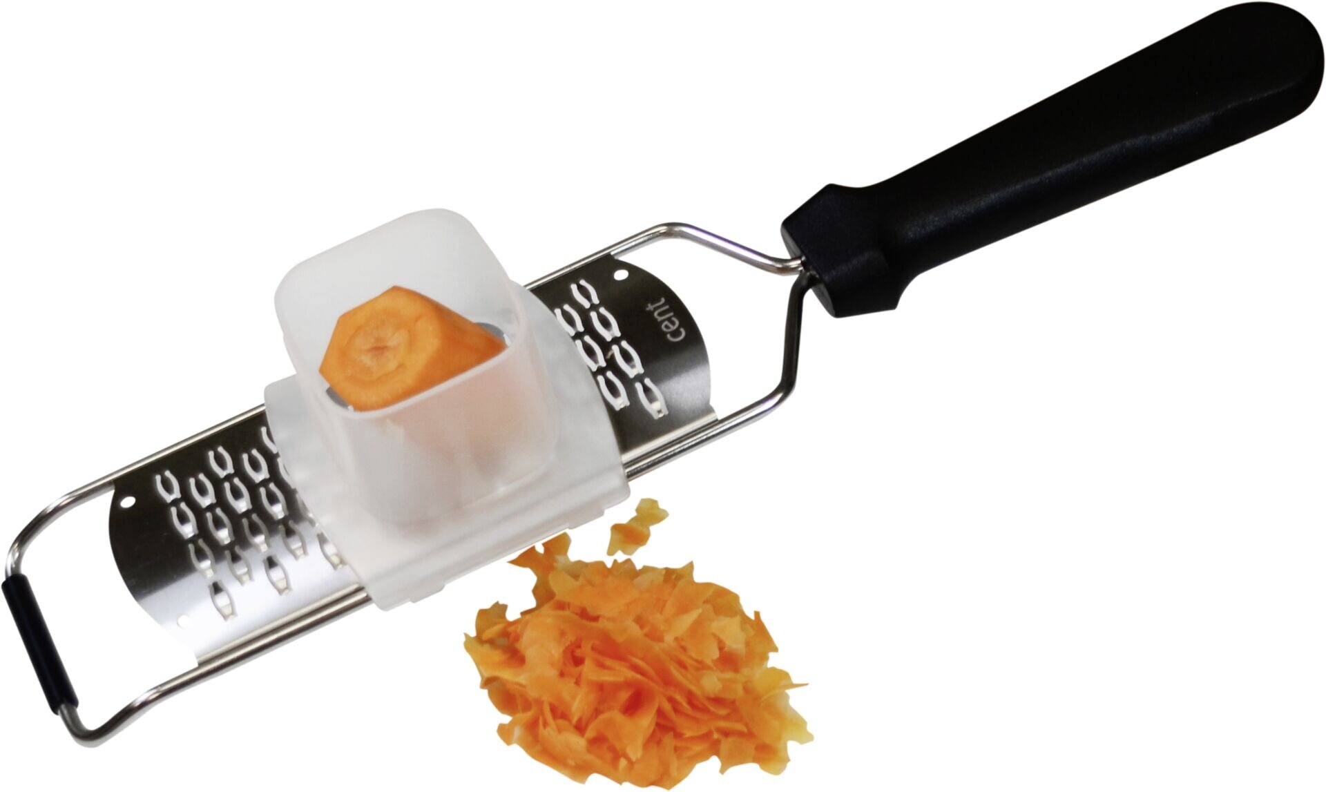 PP, schützt die Finger und ermöglicht ein gefahrloses Reiben auch von sehr kleinen Stücken, spülmaschinengeeignet.