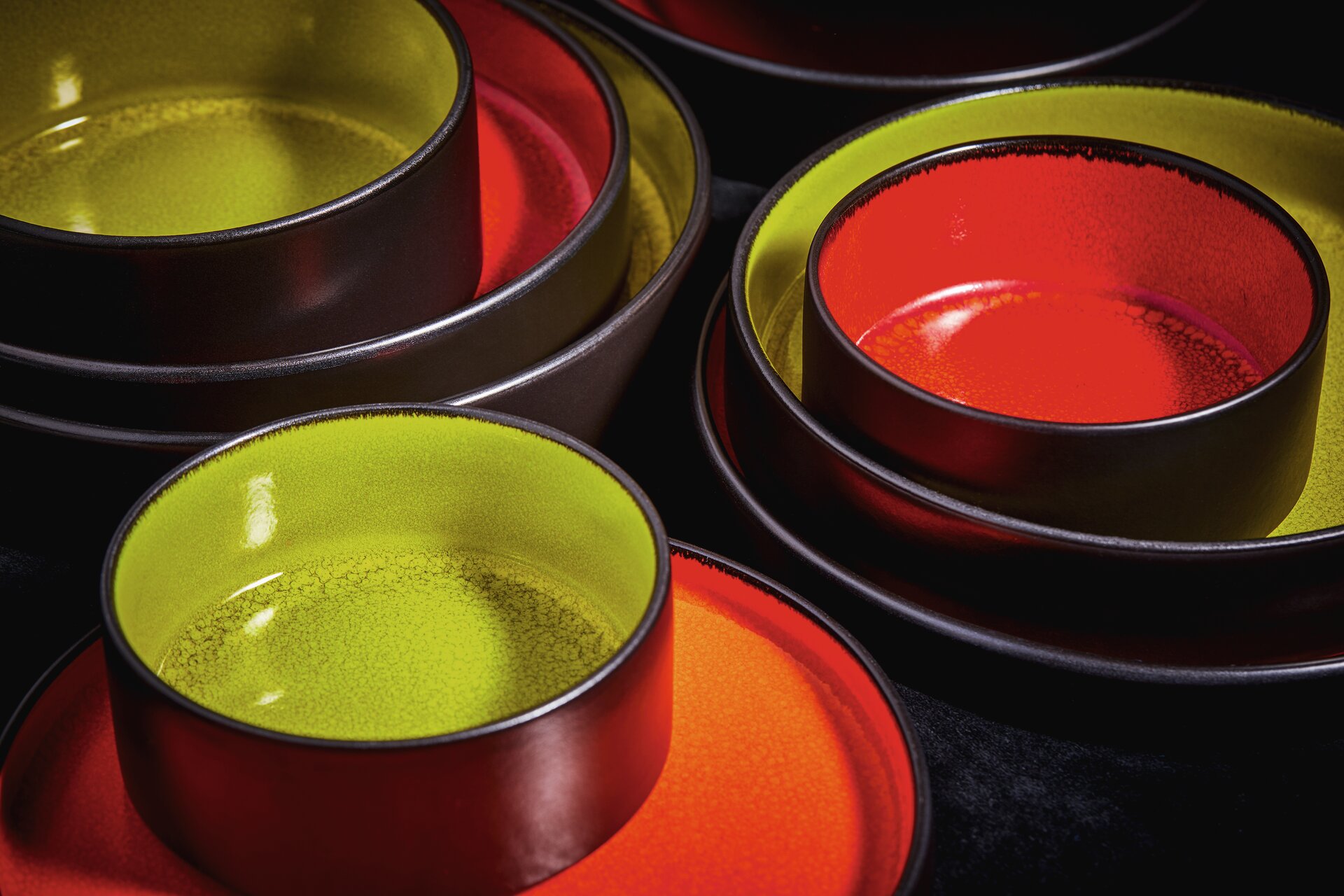 Mit einer extravaganten Präsentation zeigt FIRE erfrischende Farben und eine handgefertigte Dekoration, die jedem Stück seinen eigenen Charakter verleiht. Die unterschiedlichen Formen von tiefen Tellern und Schalen mit senkrechtem Rand bieten eine beispiellose Flexibilität beim Gebrauch.