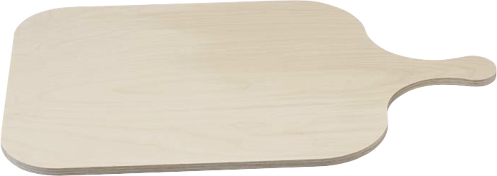 LxBxH in cm: 51x30,5x0,9 Birkenmultiplex (Holz unbehandelt). Ecken abgerundet. Länge ohne Griff 38 cm. Nicht spülmaschinengeeignet!