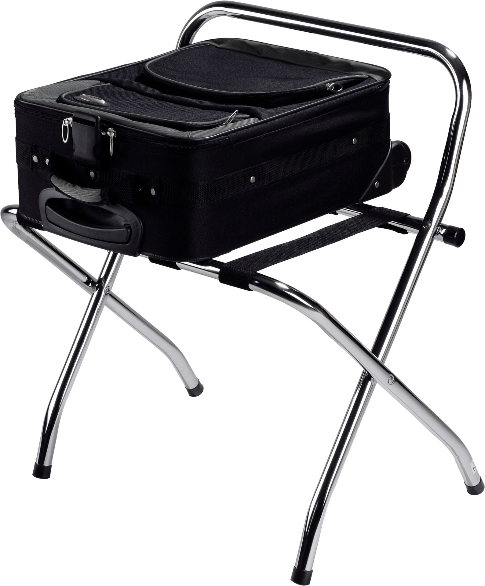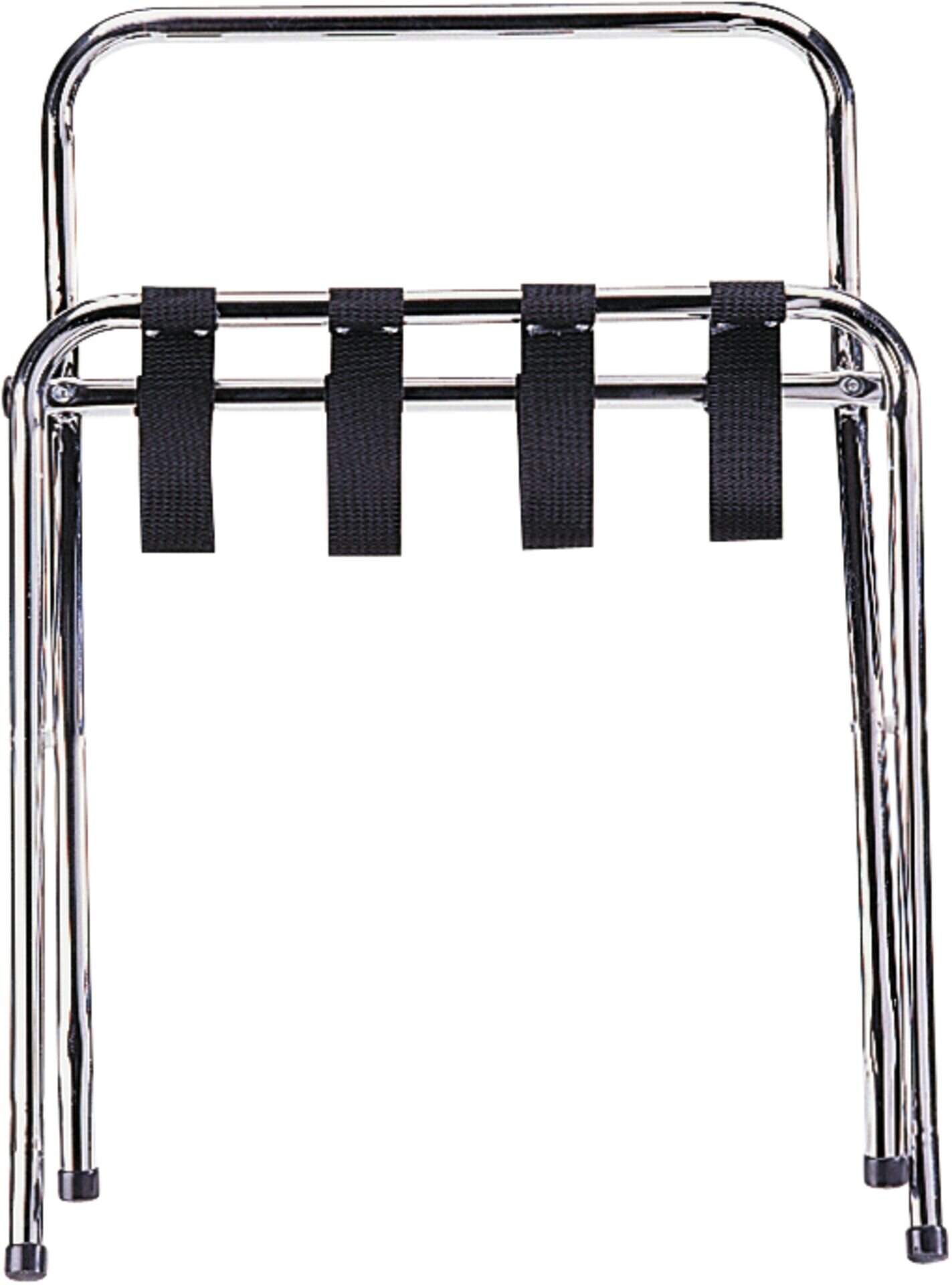 HxBxT in cm: 70x61x40 Stabiles Stahlrohrgestell, verchromt. Ø Rohr 25 mm. Bänder aus Polyester. Zusammenklappbar.