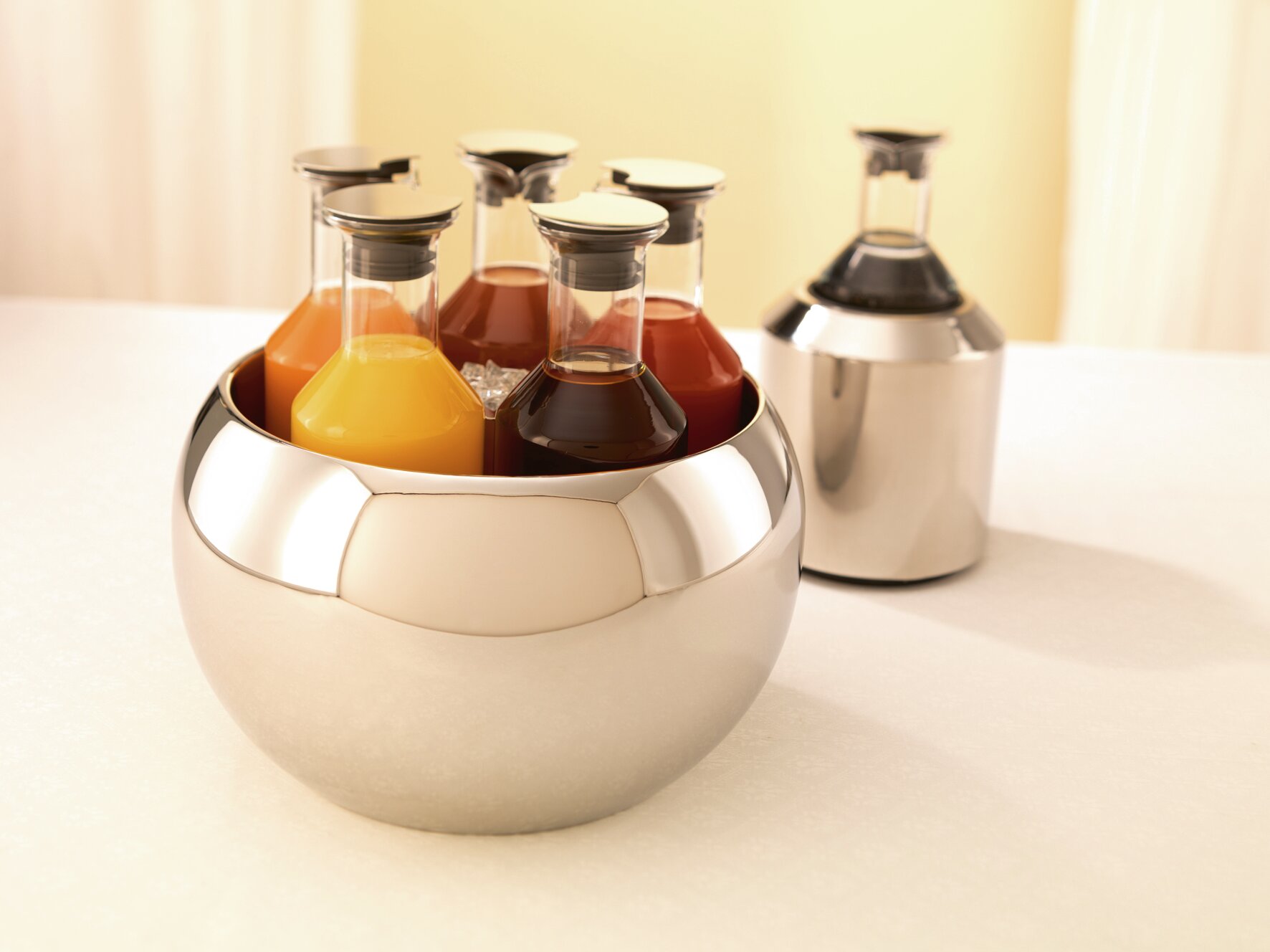 Getränkepräsentationen mit Karaffen oder Flaschen leicht gemacht. Ein variantenreiches Angebot an verschiedenen Säften, Weinen und Champagner in den attraktiven und stets gekühlten Standfüßen. Unterschiedliche Konzepte sorgen für neue Ideen auf dem Buffet.