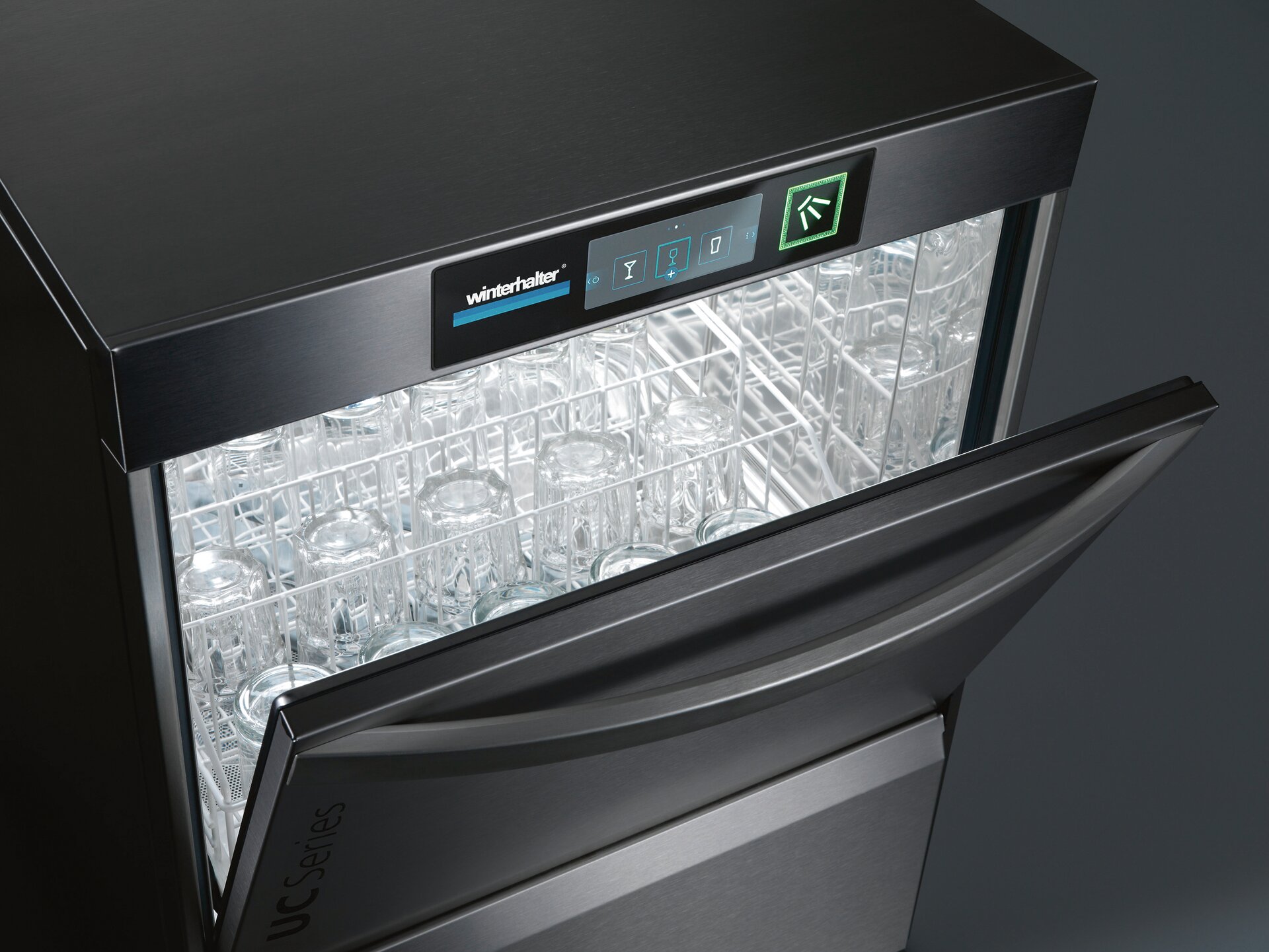 › mit QR-Code – für einfachen Zugang zur digitalen Servicewelt von Winterhalter (In Verlängerung des Displays, an der rechten Vorderseite der Maschine)