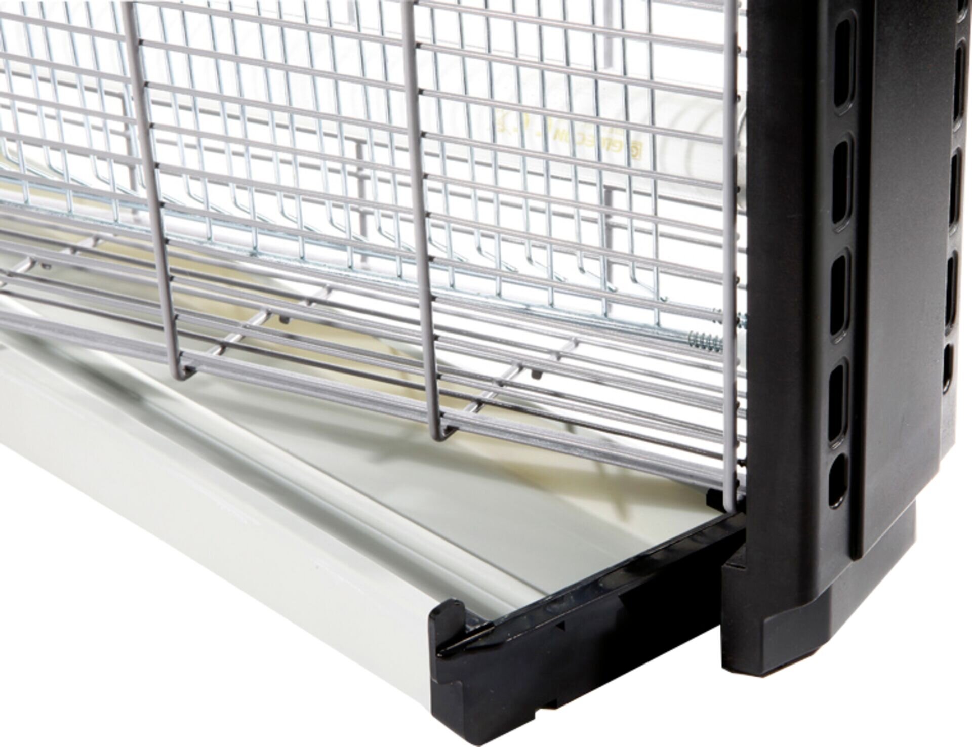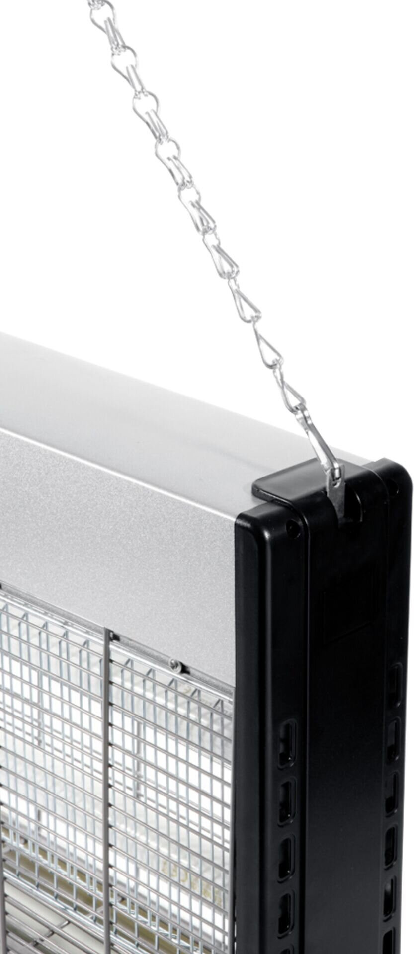 Elektronischer Insektenvernichter mit einem Gehäuse aus einer speziellen Aluminiumlegierung und feuerfestem ABS-Kunststoff. Einfache Reinigung durch herausnehmbare Schublade. 2 UV-A-Leuchtstoffröhren. Gitterspannung 2500 V. Anschlusswert 230 V. Als Decken- oder Standgerät einsetzbar. Nur zur Verwendung im Innenbereich.