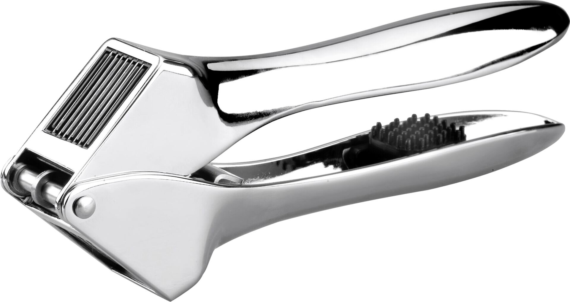 Edelstahl 18/10. Mit 2 Aussparungen zum Pressen und Schneiden. Im Griff ist ein Zubehörteil integriert, womit man die Reste, die in den Ritzen bleiben, einfach entfernen kann. Spülmaschinengeeignet.