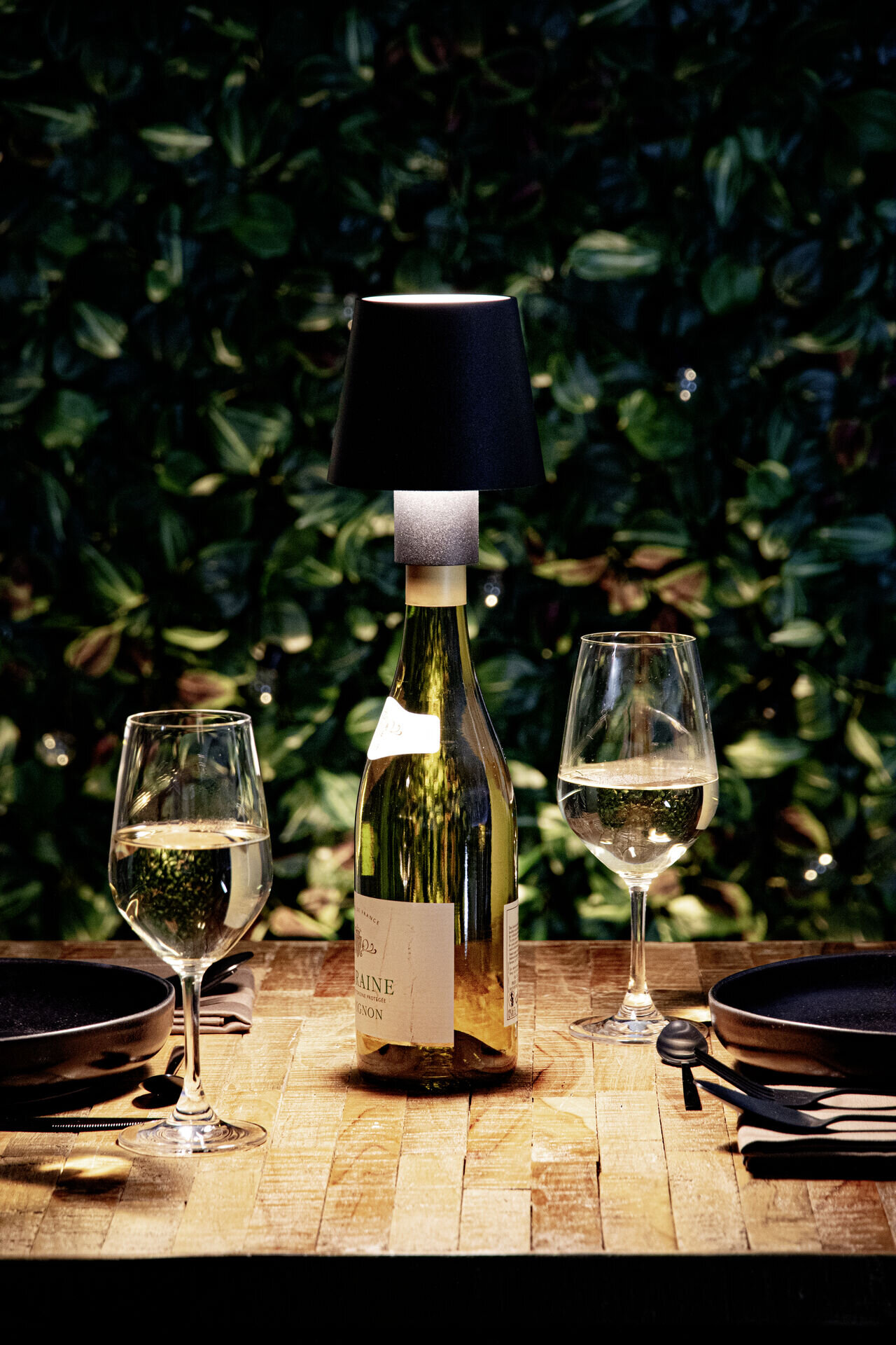 Origineller Flaschenaufsatz - geeignet für geöffnete und geschlossene Flaschen (2 Aufsätze). Tischleuchte mit integr. LED und Akku, schwarz. Stufenlos dimmbar. Wasserdicht nach IP54. Inkl. magnetischem USB Schnellladekabel. Lichttemperatur: 2800K. Geeignet für geöffnete und geschlossene Flaschen (2 Aufsätze).