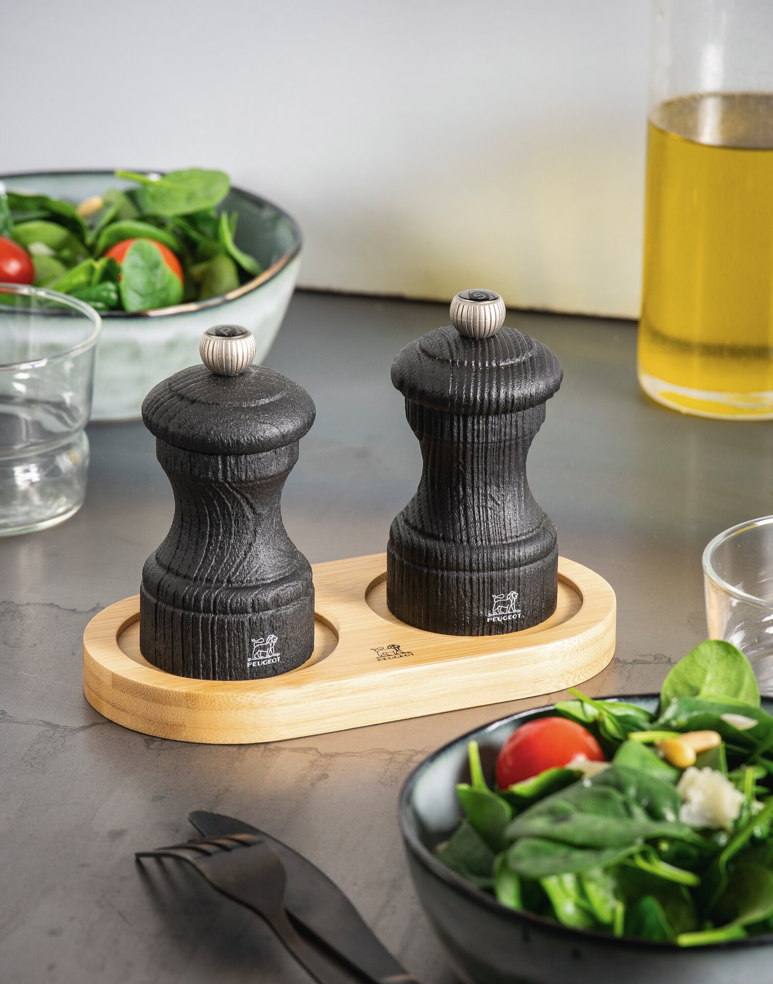 Auf dem Tisch lässt die Menage Ihr Lieblingsmühlenduo glänzen und verhindert gleichzeitig, dass sich Pfeffer- und Salzrückstände bilden.