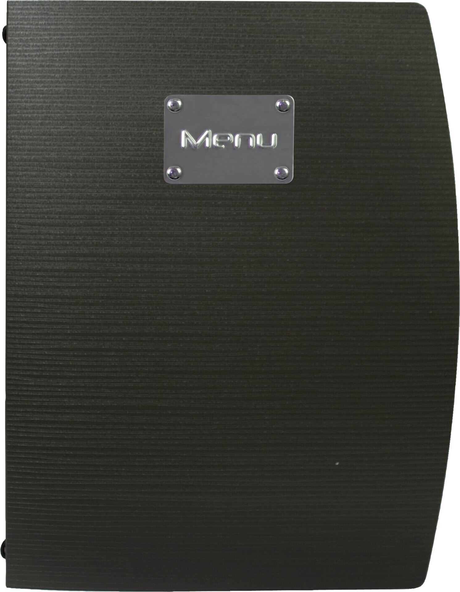 Speisekarte innen - mit Gummiband und Doppeleinlage Moderne Strukturkarte aus Kunststoff (PP). Edelstahlschild mit Aufdruck „Menu“, inkl. 1 Doppeleinlage. Für bis zu 10 Einleger geeignet. Heftung: Gummiband mit Doppeleinlage (4 Seiten). Leicht zu reinigen. Farbe: schwarz Ausführung: Menükarte "Beach" Farbe: schwarz