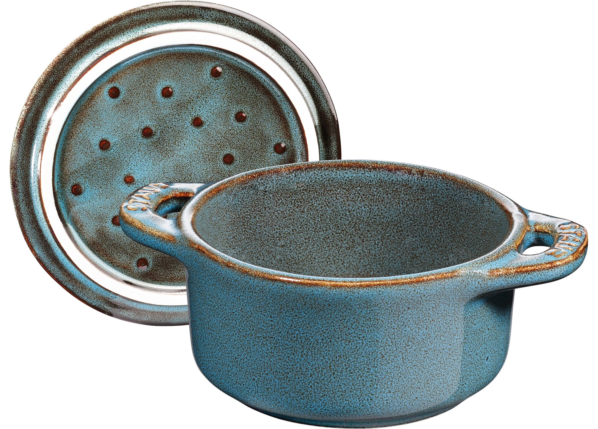 Die Mini-Cocotte der Serie Ceramic by STAUB bietet sich für die Zubereitung kleiner Mengen oder das Servieren kleiner Portionen an. Sie besteht aus Keramik und eignet sich daher auch zum Backen im Ofen. Für andere Zwecke, wie beispielsweise für das Aufwärmen kleiner Mahlzeiten in der Mikrowelle, können Sie die Cocotte ebenfalls verwenden. Dank ihrer Größe ist sie ideal für ein portionsweises Zubereiten und Servieren. Die Mini-Cocotte von STAUB wird aus besonders hochwertiger Keramik gefertigt und anschließend mit einer speziellen Glasur versehen. Diese Glasur sorgt für eine lange Lebensdauer und verleiht der Cocotte gleichzeitig ihre besondere Optik. Die kleine Cocotte können Sie dank dieser insbesondere zum Servieren am Tisch nutzen. Aufgrund der vielen Verwendungsmöglichkeiten werden die Mini-Cocottes von STAUB, die stets Unikate sind, auch gern als kleine Mitbringsel für Freunde oder Verwandte genutzt.