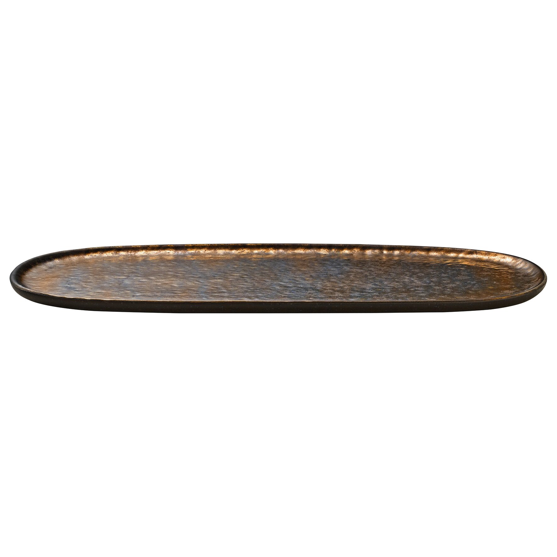 Ihre schimmernde Kupfer-Optik sowie die gehämmert wirkende Oberfläche machen die Nivo Metallic Platte flach 30cm zu einem aufsehenerregenden Tischbegleiter. Zeige deine Kreationen auf dieser extravaganten ovalen Platte und beweise Mut zum Besonderen. Moderne Speiseplatte in Kupfer-Optik und robuste Stoneware.