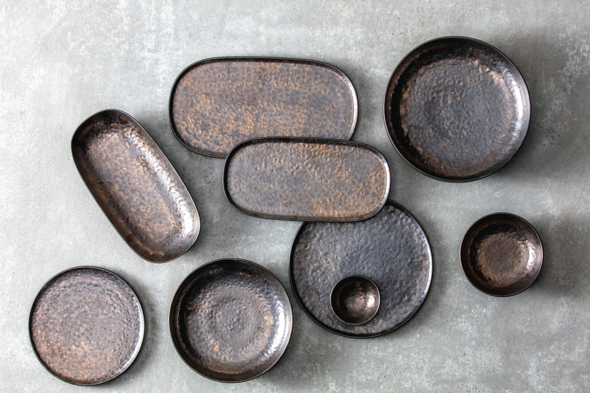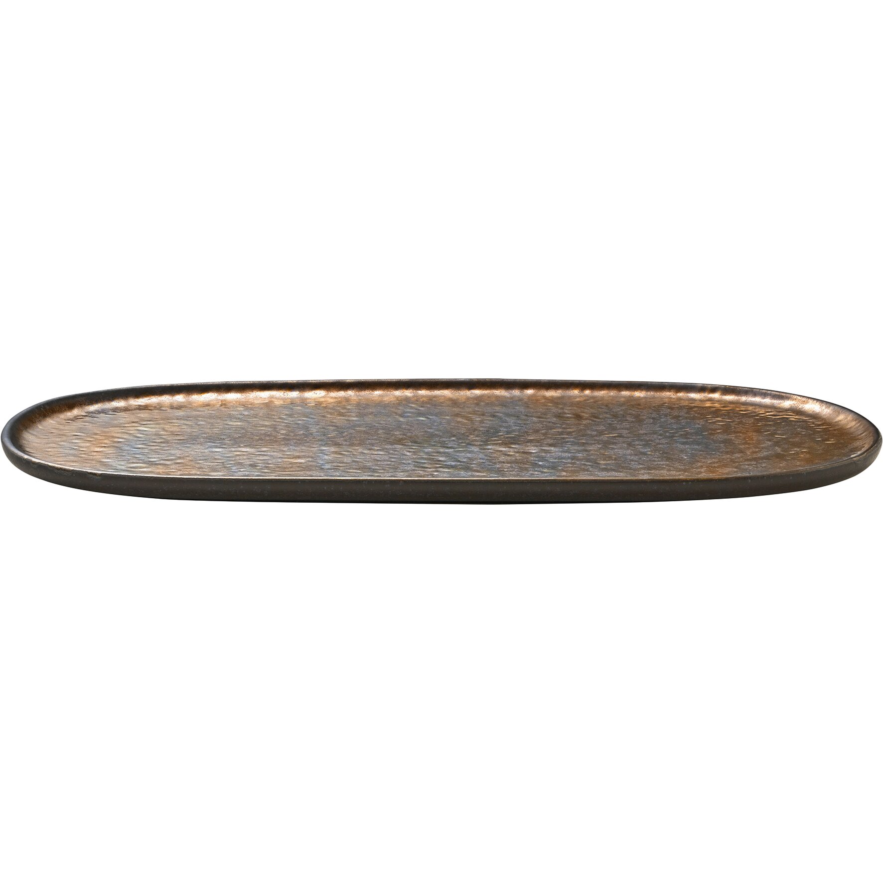 Die gehämmert wirkende Speisefläche in aufregendem Braun-Kupfer-Metallic machen die Nivo Metallic Platte flach 34cm zu einem aufsehenerregenden Tischbegleiter. Zeige deine Kreationen auf dieser extravaganten ovalen Steingut Platte und beweise Mut zum Besonderen. Moderne Speiseplatte in Kupfer-Optik und robuste Stoneware.