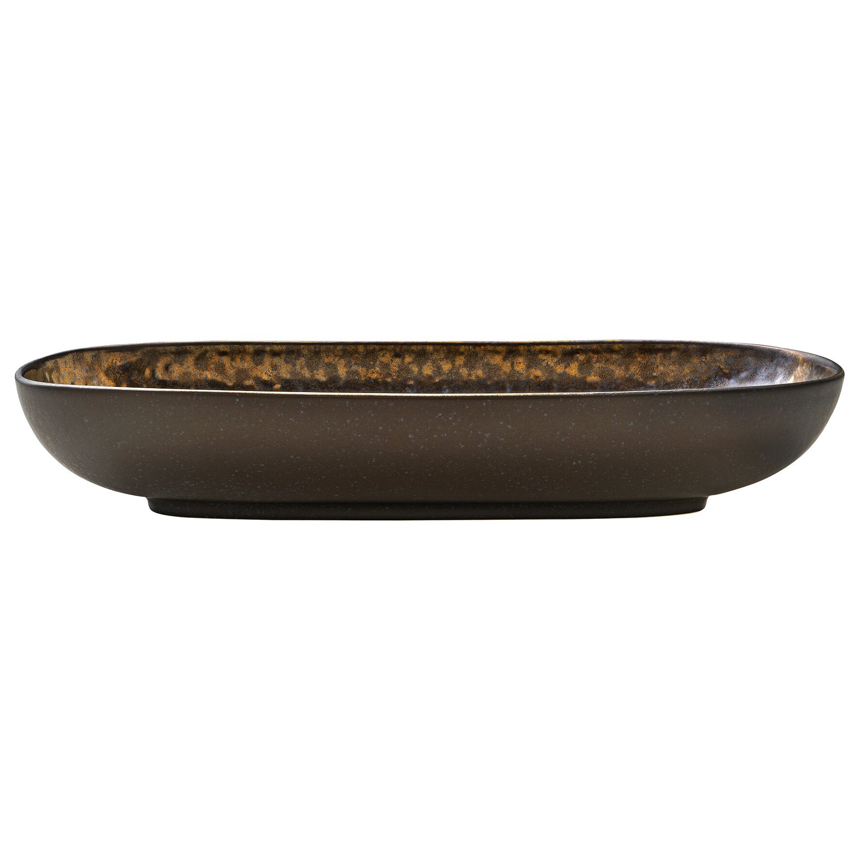 Die gehämmert wirkende Speisefläche in aufregendem Braun-Kupfer-Metallic machen die Nivo Metallic Platte tief 30cm zu einem aufsehenerregenden Tischbegleiter. Zeige deine Kreationen auf dieser extravaganten ovalen Steingut Platte und beweise Mut zum Besonderen. Moderne Speiseplatte in Kupfer-Optik und robuste Stoneware.