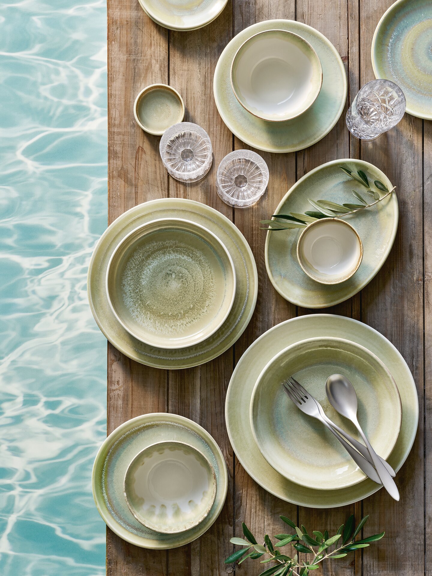 Die Grün-, Braun- und Blautöne erinnern an die mediterrane Pflanzenwelt, an Meer und Terracotta. Reaktive Glasuren sorgen für besondere Effekte und handwerkliche Unikate. Die Artikel von PERFECT MATCH sind in fünf kombinierbaren Farben erhältlich.