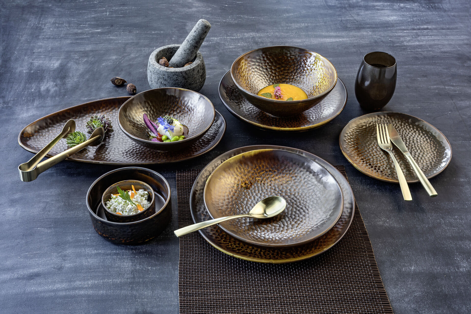 Porzellan. Farbe braun. Diese trendige Serie besticht durch ihre gehämmerte Struktur und den Farbverlauf in verschiedenen Brauntönen. Die überwiegend matte Glasur wird durch glänzende Akzente optimal in Szene gesetzt. So wird jedes Stück zum Unikat. Unterstützt wird die Einzigartigkeit dieser Serie durch die unregelmäßigen, organischen Formen. Mischsortierung. Spülmaschinengeeignet.