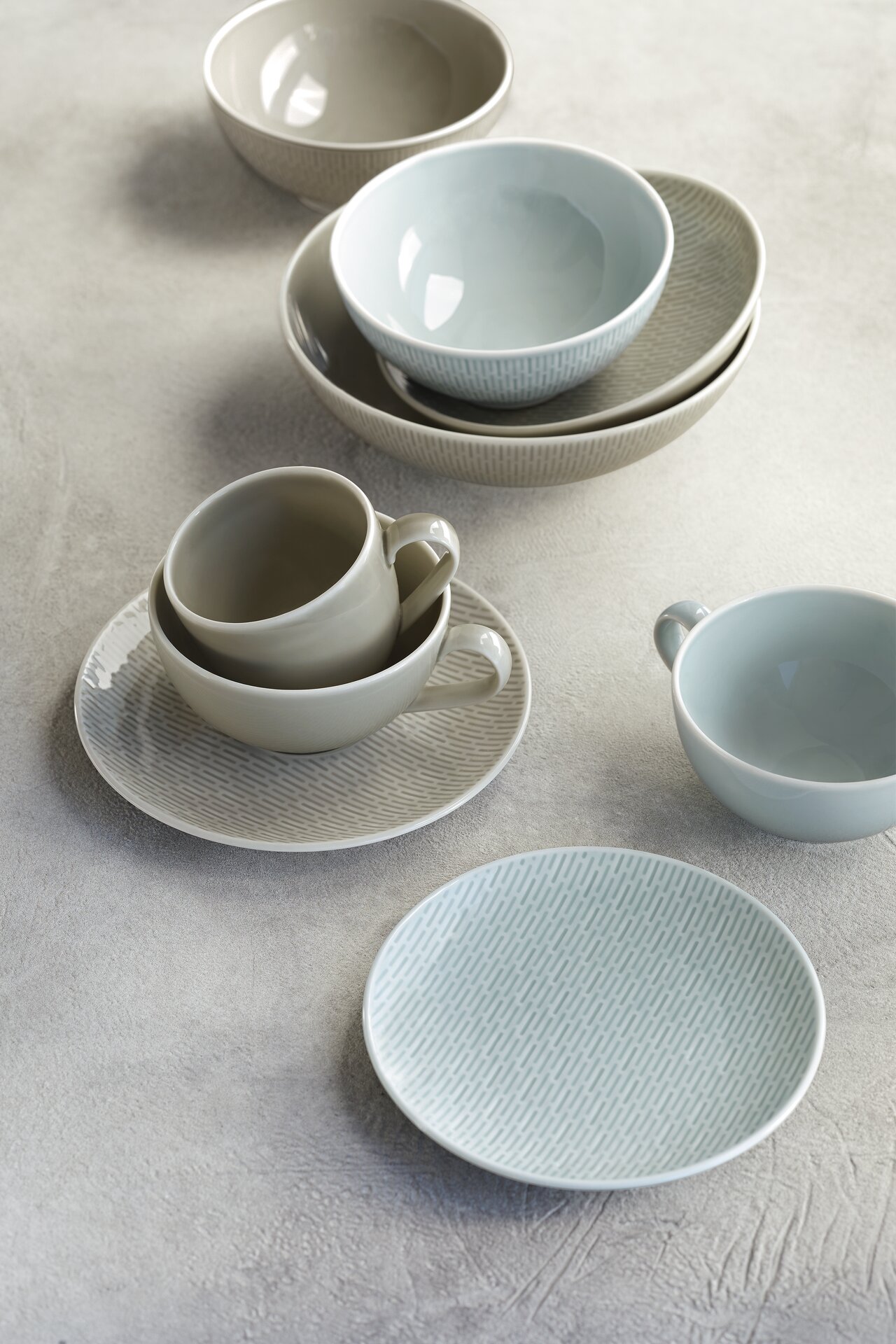 Das Design von SCOPE ist klar und dadurch äußerst vielseitig einsetzbar. Neben glatten und strukturierten Tellern, Bowls, Schalen und Platten in reinem Weiß umfasst das Sortiment auch Artikel in den Glasurfarben GLOW GRAY und SEA. Die Farbintensität variiert bei jedem Stück leicht, was den handgefertigten Charakter der Kollektion betont.