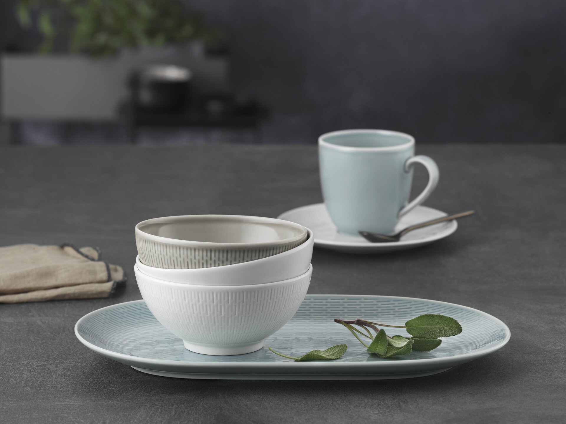 Das Design von SCOPE ist klar und dadurch äußerst vielseitig einsetzbar. Neben glatten und strukturierten Tellern, Bowls, Schalen und Platten in reinem Weiß umfasst das Sortiment auch Artikel in den Glasurfarben GLOW GRAY und SEA. Die Farbintensität variiert bei jedem Stück leicht, was den handgefertigten Charakter der Kollektion betont.