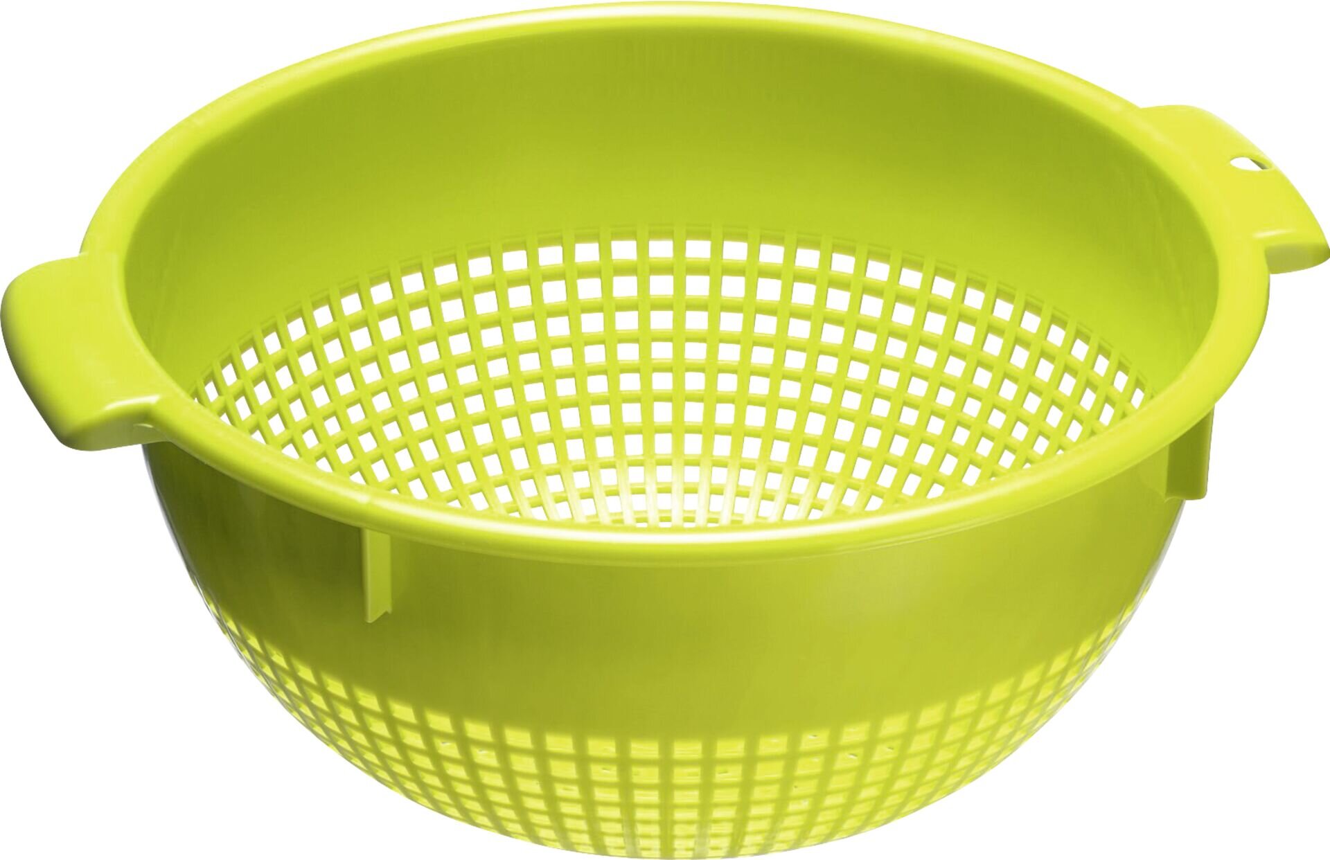 Material: PE = Polyethylen, BPA FREE, apfelgrün, 4 Aufsatzrastern sorgen dafür, dass der Seiher fest und ein Stück erhoben auf einem Ø 24cm Topf sitzt, spülmaschinengeeignet, Made in Germany.