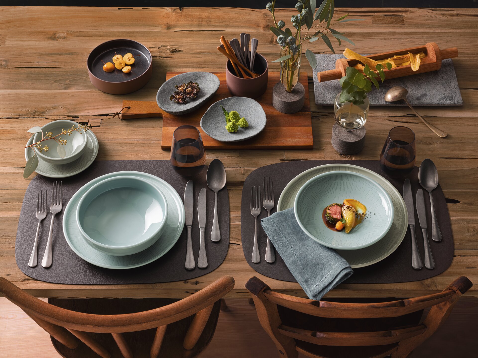 SHIRO GLAZE gibt dem kühlen, skandinavischen Design der Form einen emotionalen Touch. Durch den von Artikel zu Artikel wechselnden, leicht wolkigen Charakter der Farbglasuren entsteht eine lebhafte handwerkliche Optik. Die pastelligen Farbnuancen FROST und STEAM harmonieren bestens miteinander. Reizvolle Kontraste bringt das Zusammenspiel von reliefierten mit glatten Teilen ins Spiel.