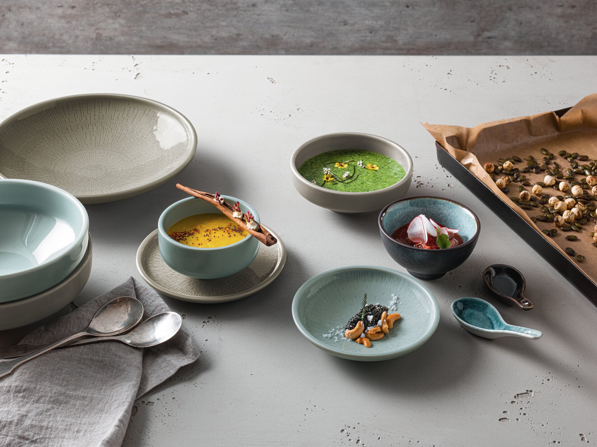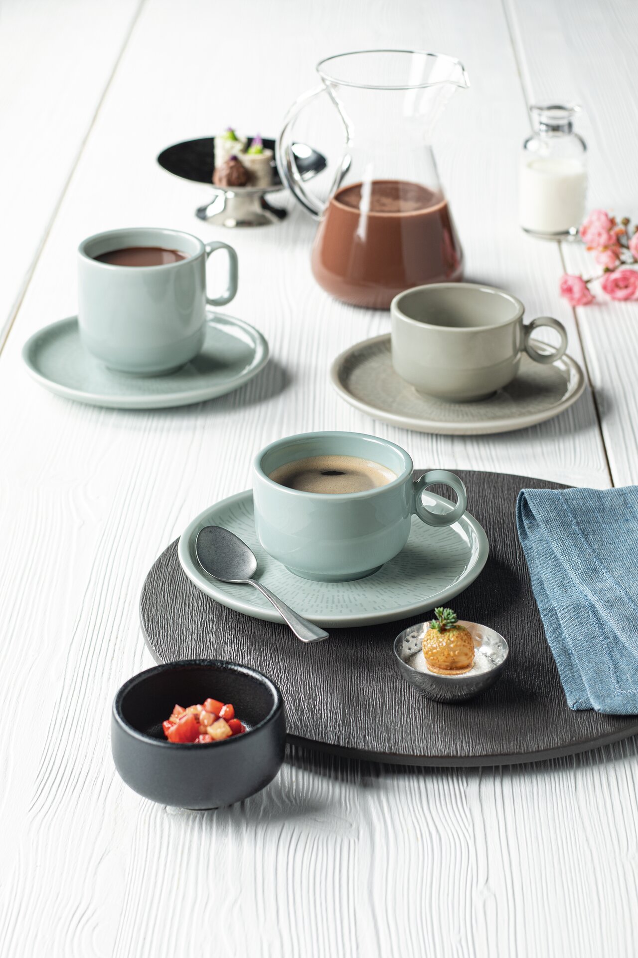 SHIRO GLAZE gibt dem kühlen, skandinavischen Design der Form einen emotionalen Touch. Durch den von Artikel zu Artikel wechselnden, leicht wolkigen Charakter der Farbglasuren entsteht eine lebhafte handwerkliche Optik. Die pastelligen Farbnuancen FROST und STEAM harmonieren bestens miteinander. Reizvolle Kontraste bringt das Zusammenspiel von reliefierten mit glatten Teilen ins Spiel.
