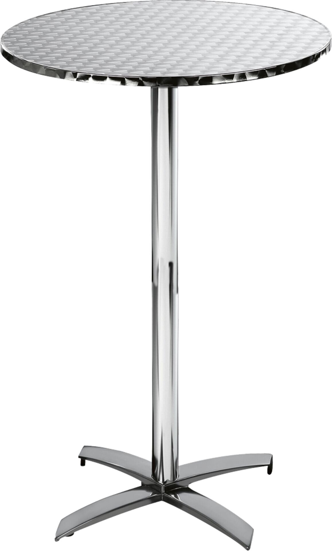 ØxH in cm: 70x110 Tischhöhe: 110 cm Alu Rohr 60x1,2 mm. Platte Edelstahl, Unterseite MDF, 2 cm stark. 2 höhenverstellbare Füße. Platzsparend: Platte Edelstahl abklappbar, seitlich stapelbar.