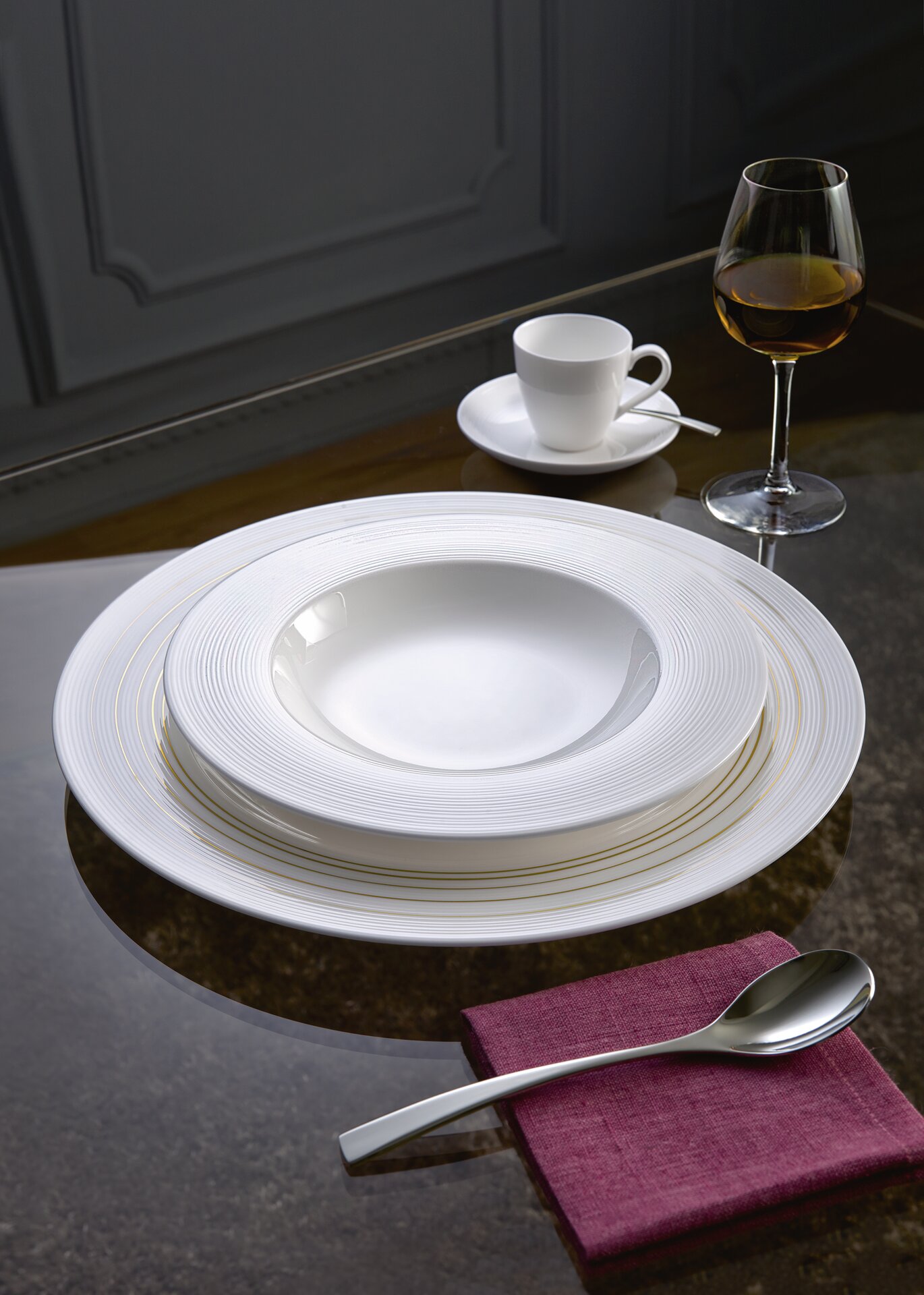 Das reduzierte Weiß-in-Weiß Dekor von Stella Vogue, ergänzt um dezente Highlights in edlem Mattgold, verleiht jeder großen Tafel Anmut und Noblesse. Das feine Dekor unterstreicht den Glamour und das Flair der großen Bankette.