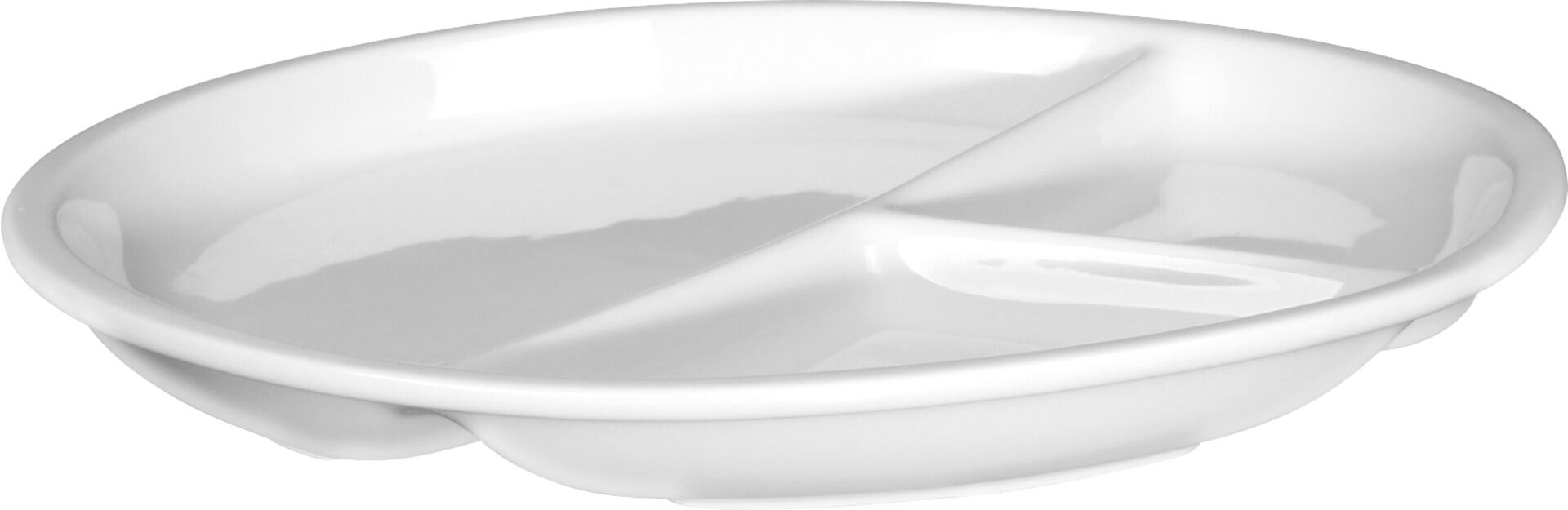 3-geteilt mit schmaler Fahne, Inhalte strichvoll: kleine Segmente je 0,10 l, großes Segment 0,30 l, stapelbares GV Porzellan, weiß, Mischsortierung. Temperaturbeständig bis +250° C. Mikrowellengeeignet.